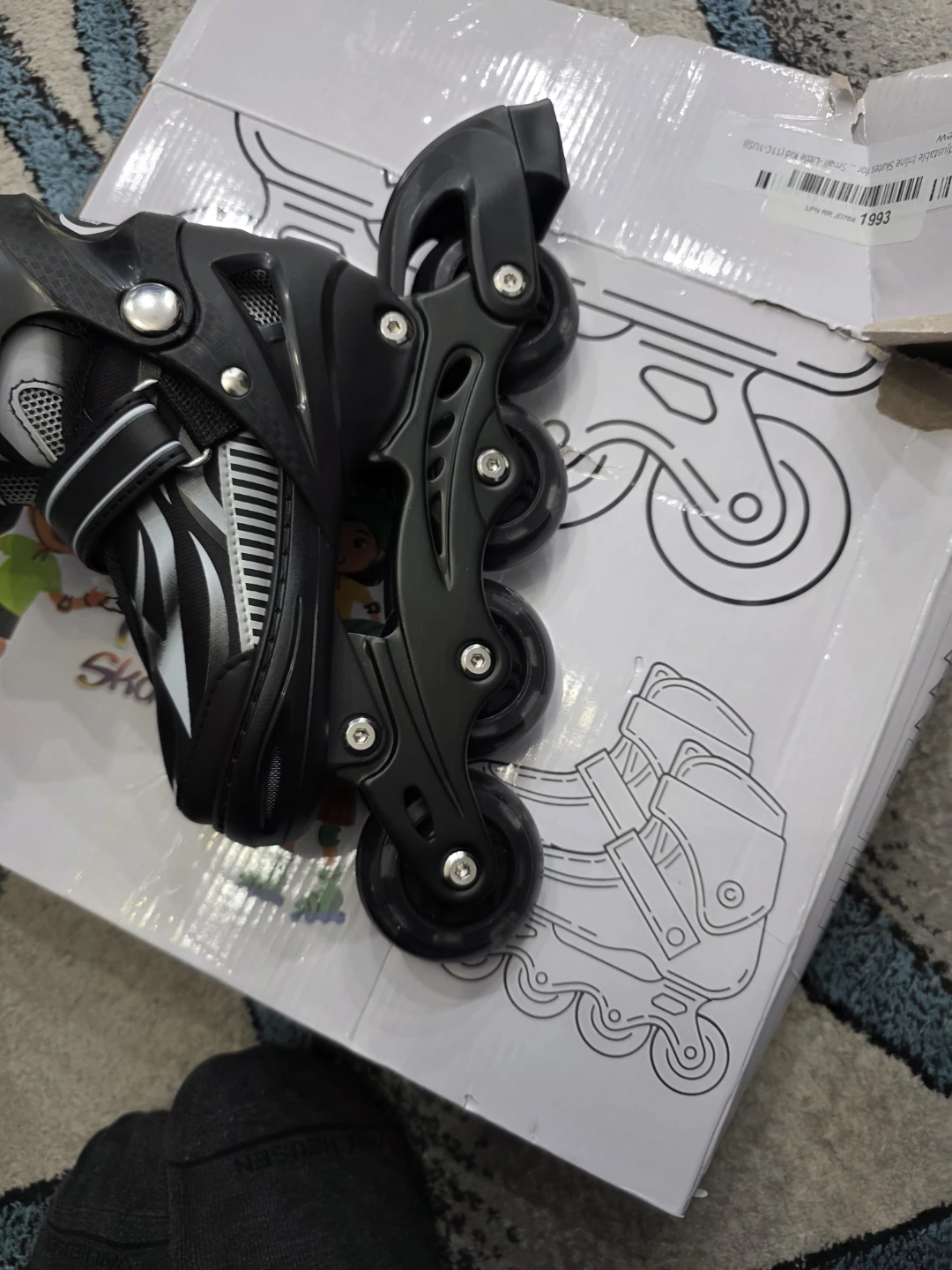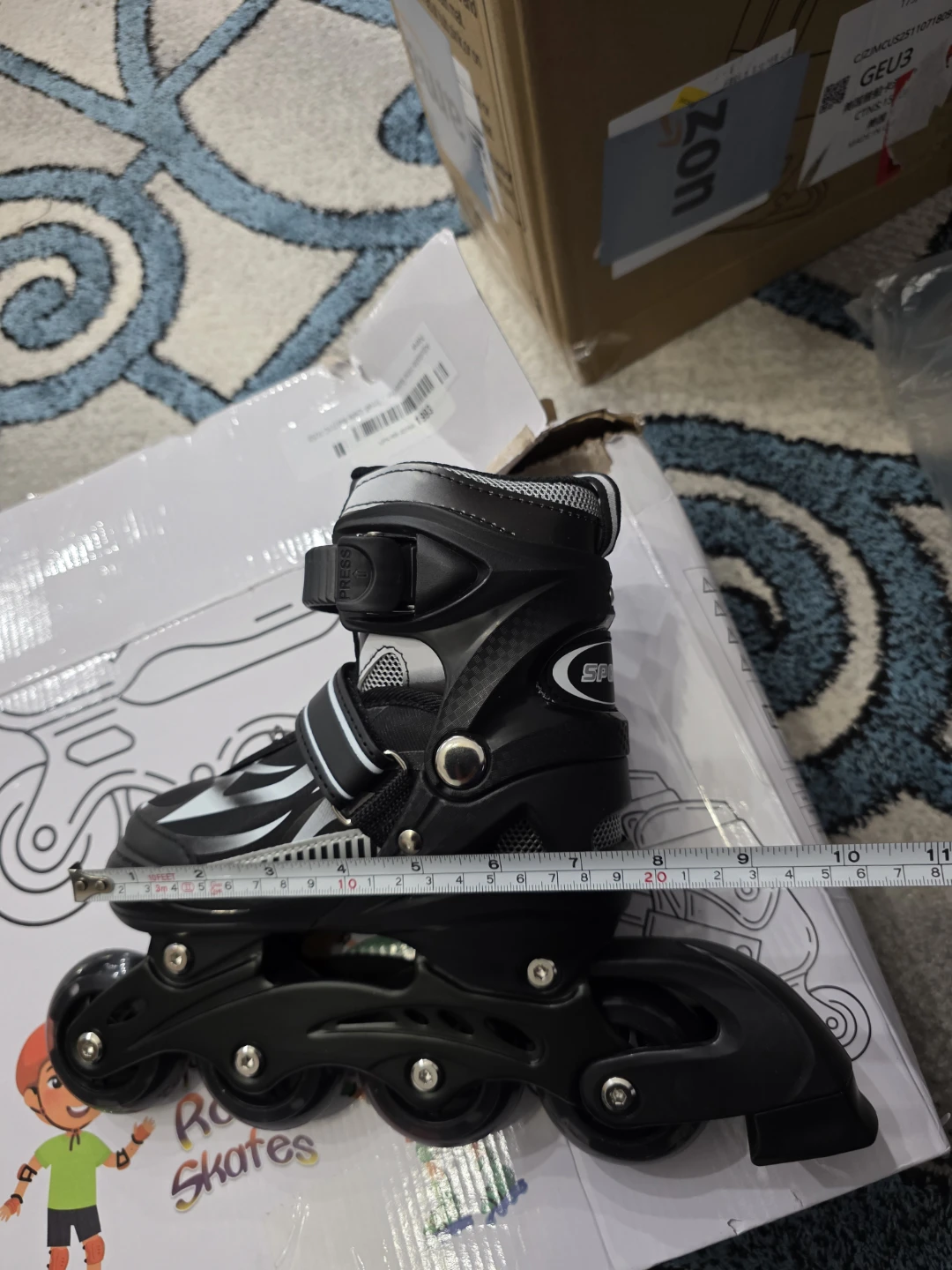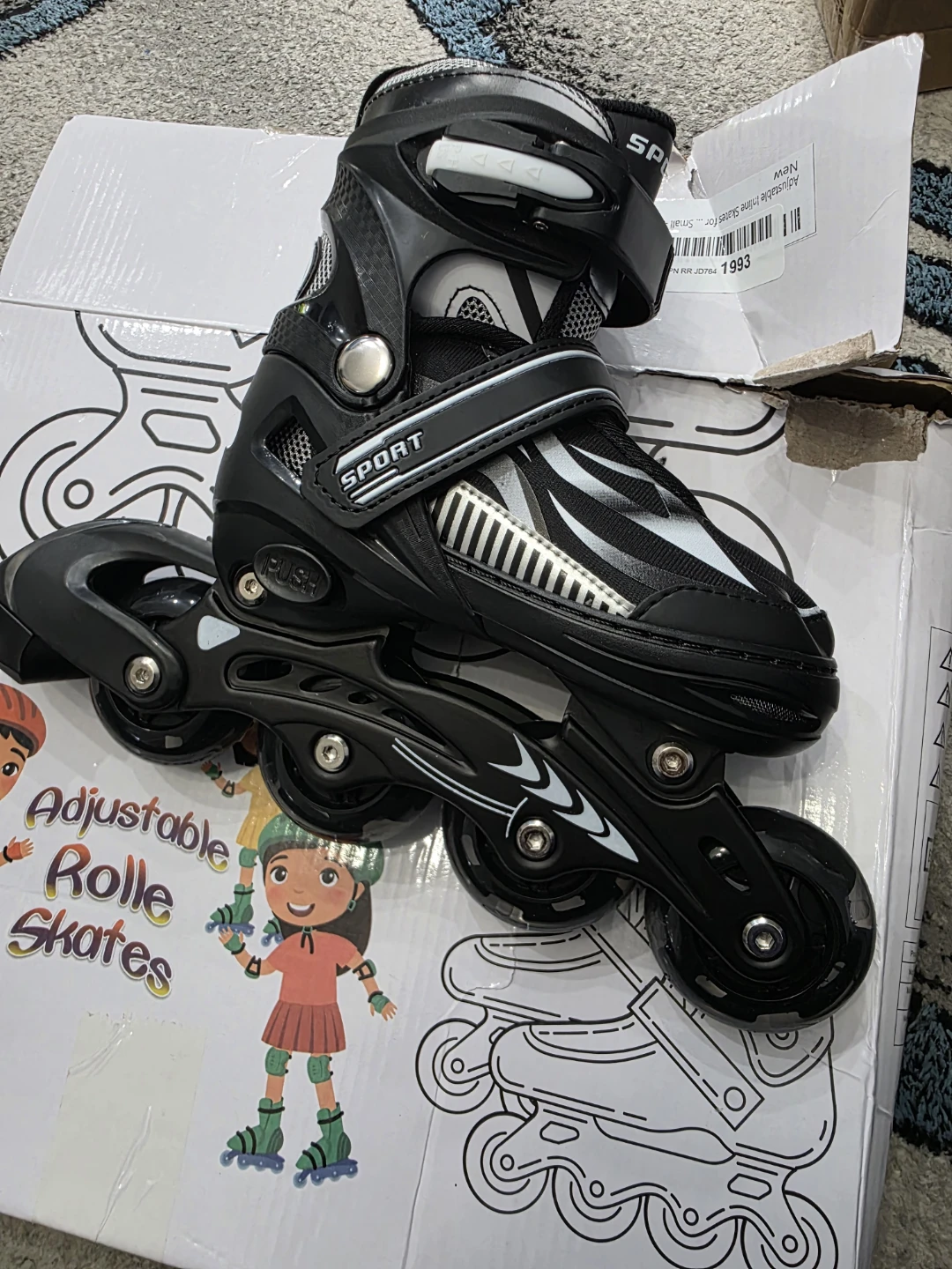 Black adjustable inline skates for kids. These skates are designed for fun and learning to skate. They feature a secure closure system for a snug fit. Excellent for outdoor activities!