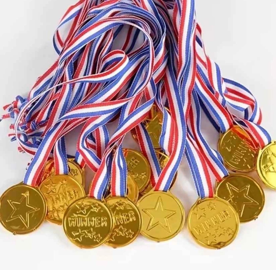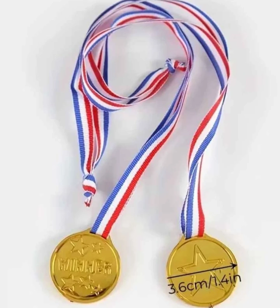 Ten gold medals with patriotic ribbons for your winners. Each medal features a star design or the word 'WINNER' in raised lettering. Medal diameter is approximately 3.6cm (1.4 inches). These are great for awarding achievements at parties or events!