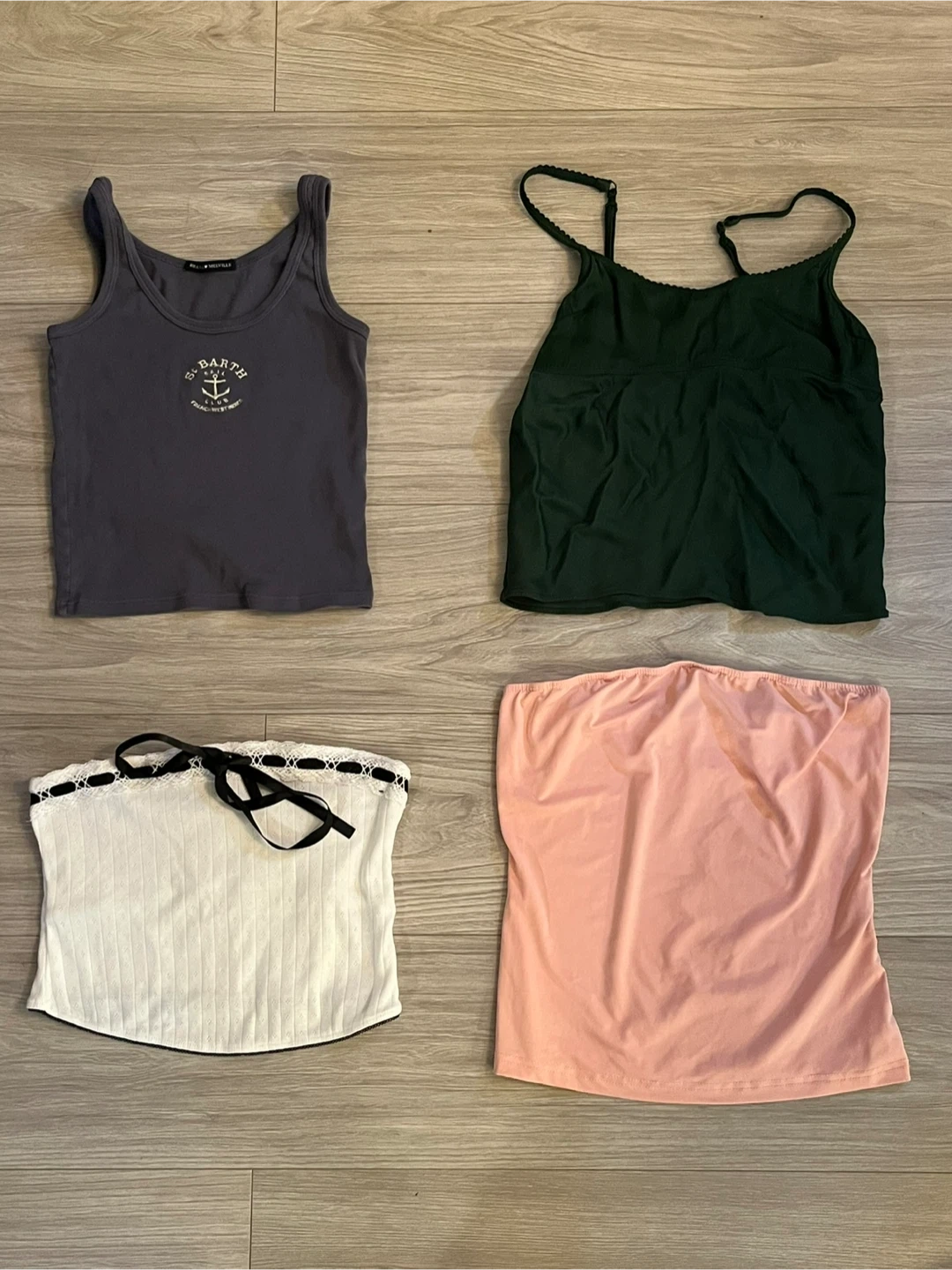 This bundle includes four stylish women's tops. There's a grey tank top with a St. Barth graphic, a dark green cami top with adjustable straps, a white ribbed tube top with lace trim and a black bow, and a light pink strapless tube top. These tops are great for layering or wearing on their own during warmer weather!