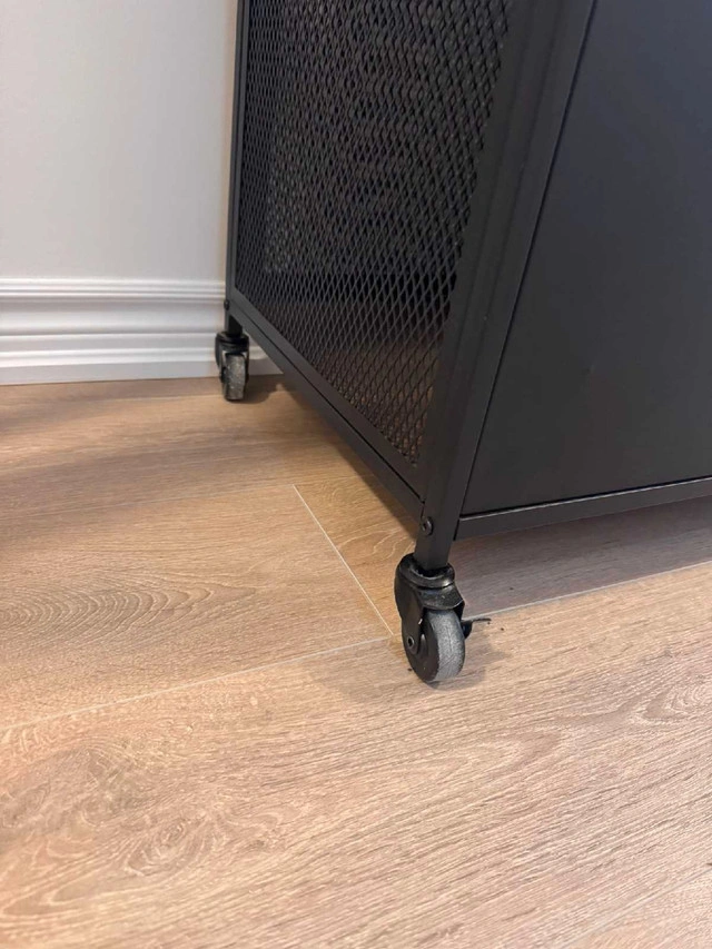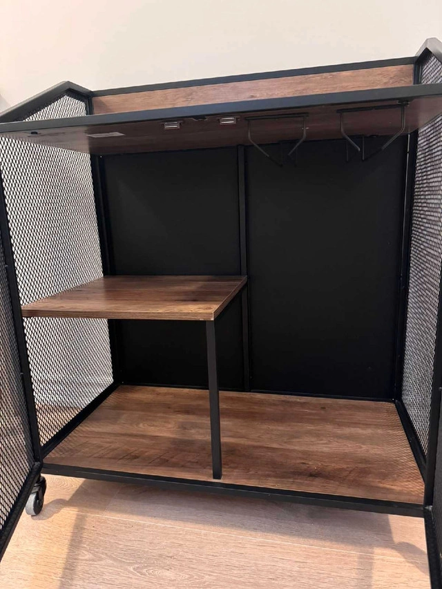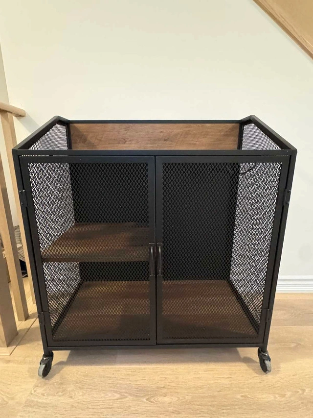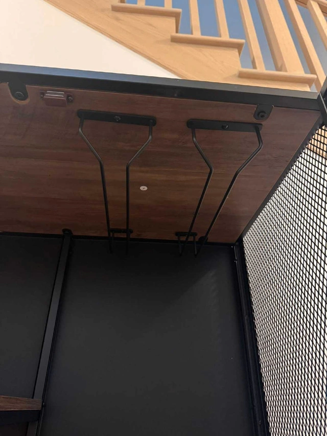 This industrial bar cart features a boxy metal mesh frame with warm, complementary wood tones. Two matching mesh metal doors open to reveal shelved storage for bottles of your favourite wine and spirits, while a stemware rack keeps all your wine glasses, champagne flutes, or snifters at the ready. Rounding out the design, a manufactured wood bar top with rustic wood-grain laminate provides an excellent surface for mixing and serving craft cocktails, while casters let you take the party to your guests.