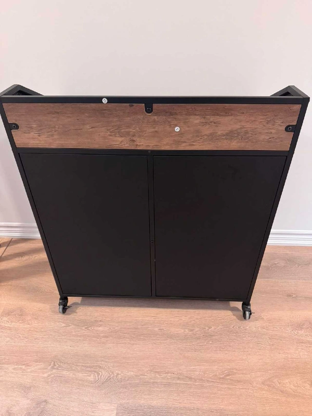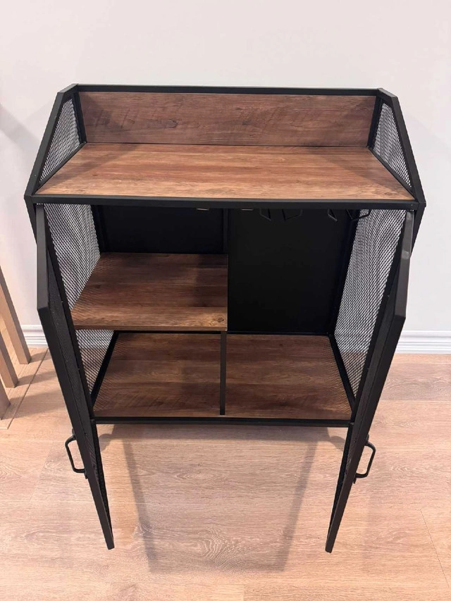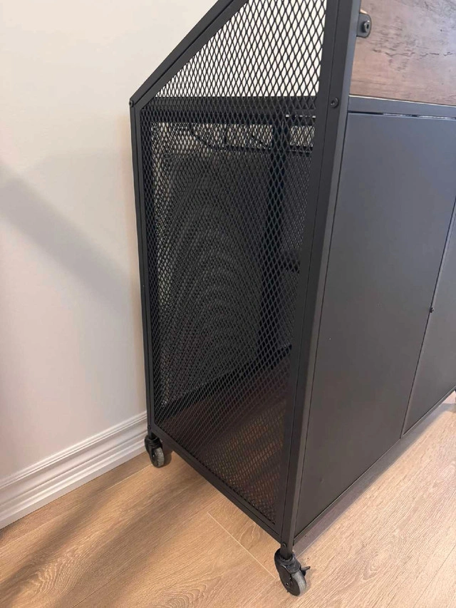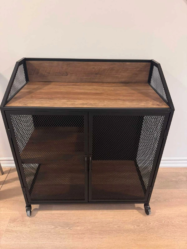 Features metal mesh enclosed storage for bottles and glasses. Two stemware racks hold about three glasses each. A fixed shelf on one side leaves room for taller bottles. Locking casters roll smoothly to keep the party moving. Magnetic door closures keep bottles and glasses safe.