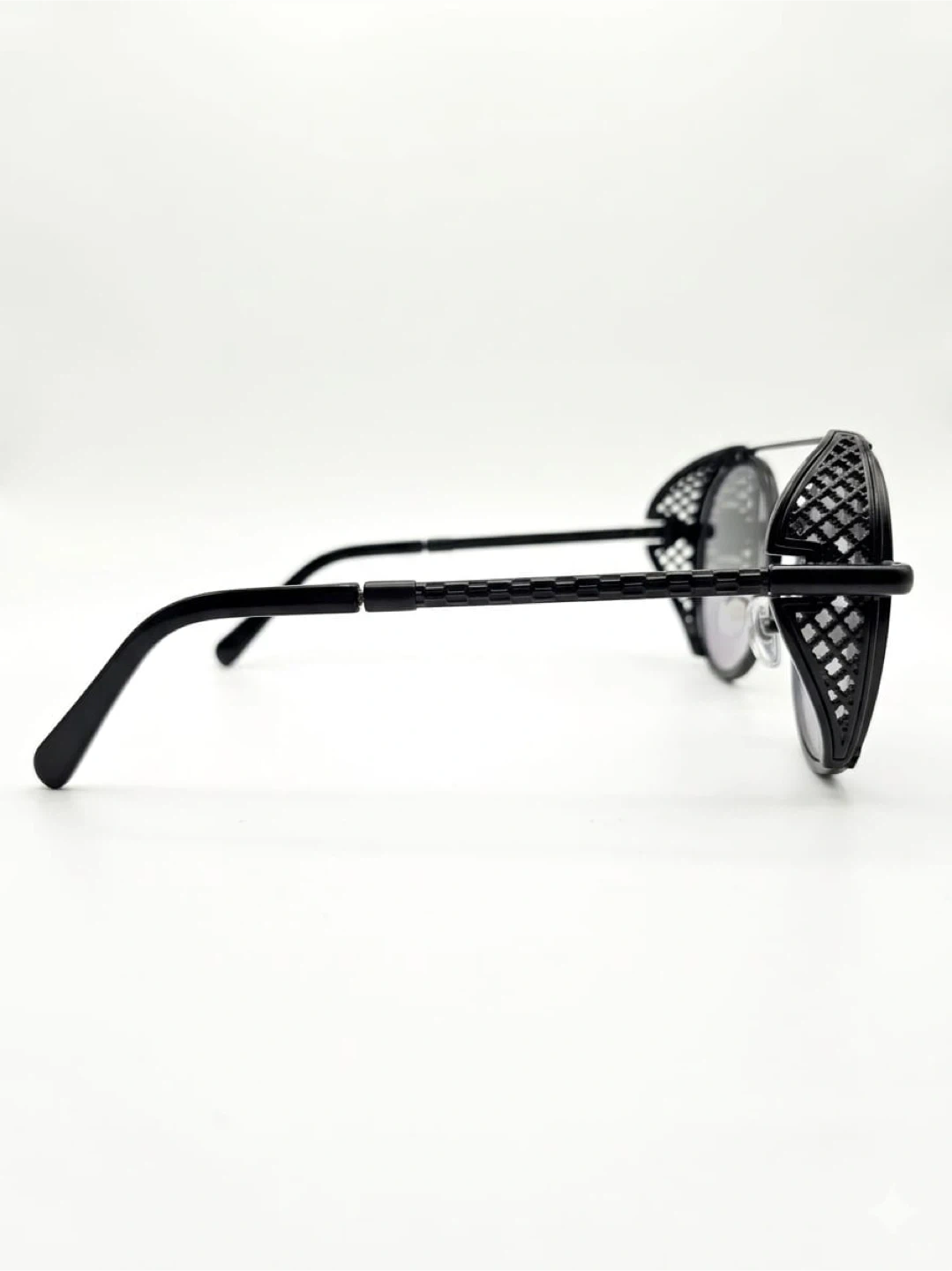These round eyeglasses have a distinctive steampunk-inspired design. They feature black frames with unique textured side shields. These glasses are a statement accessory!