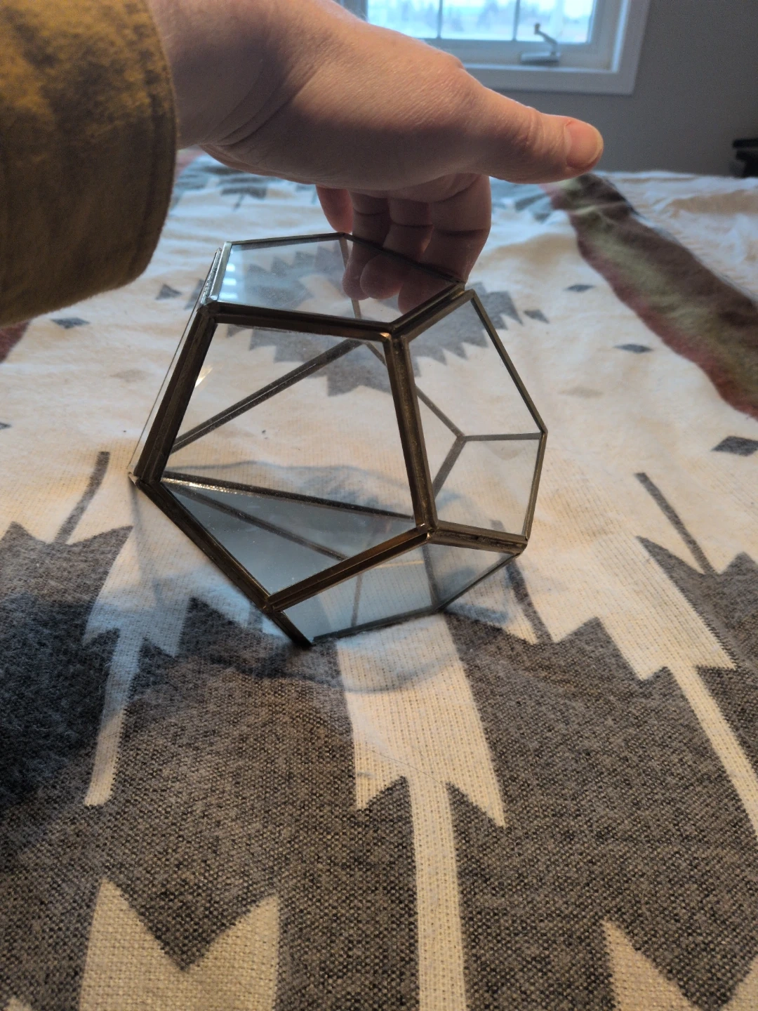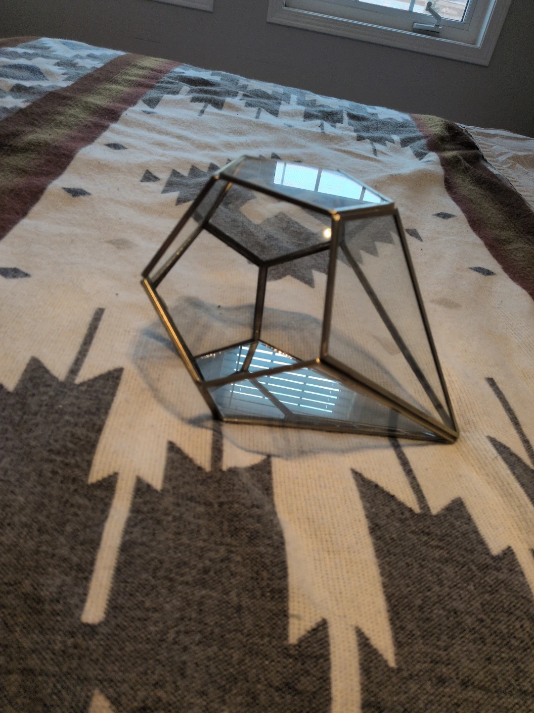 This geometric terrarium features clear glass panels with a brass-toned metal frame. It's a unique decorative piece for displaying small plants or air plants. It's suitable for adding a touch of modern decor to any shelf or tabletop.