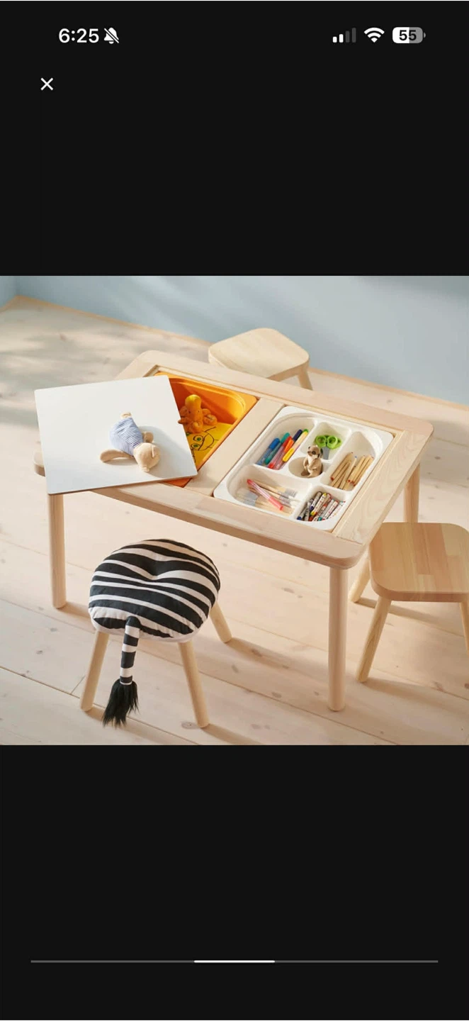 IKEA FLISAT children’s table in very good used condition. Clean, sturdy, and well maintained. Natural solid wood frame with two removable white tabletop panels — great for crafts, drawing, playtime, or sensory activities.