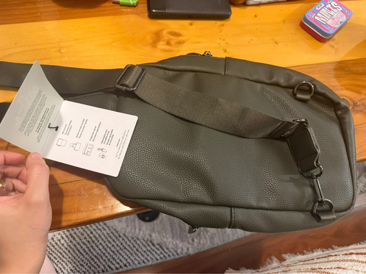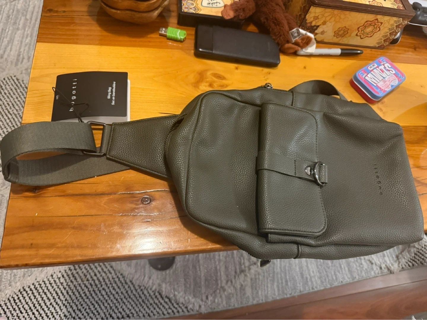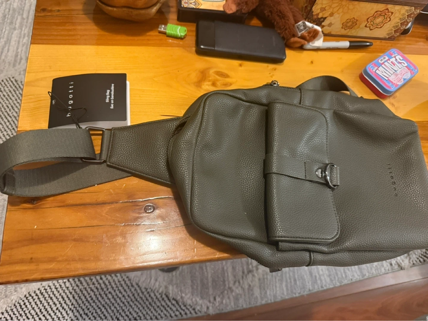Bugatti sling bag in an olive green faux leather. It features a main zippered compartment and an exterior pocket with a snap closure. Dimensions are 11.75" W x 6.5" H x 3.5" D. This bag is great for carrying essentials on the go!