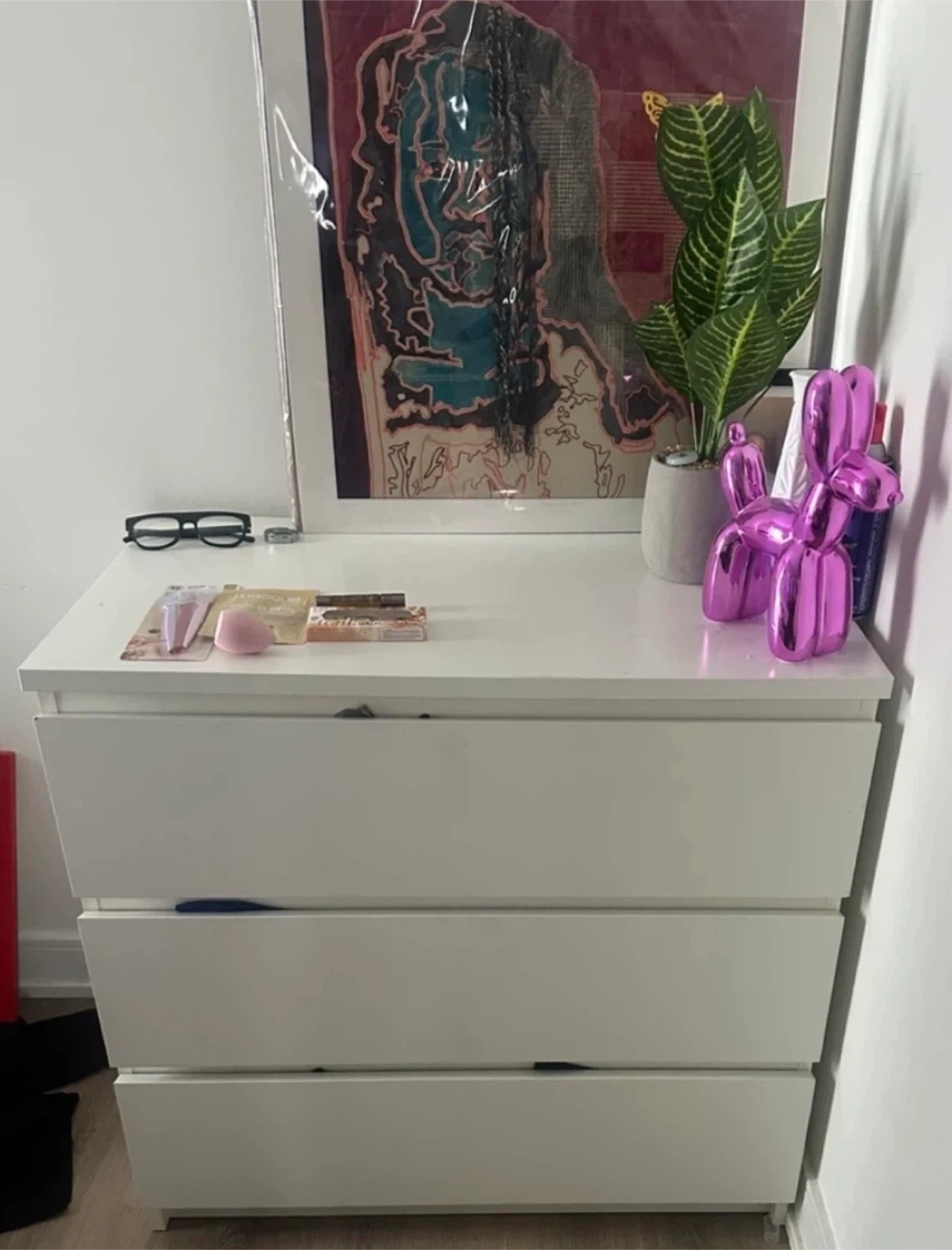 White dresser with three drawers. It's a simple, clean design that offers plenty of storage space. This dresser is great for organizing clothes or other items in your bedroom or any room.