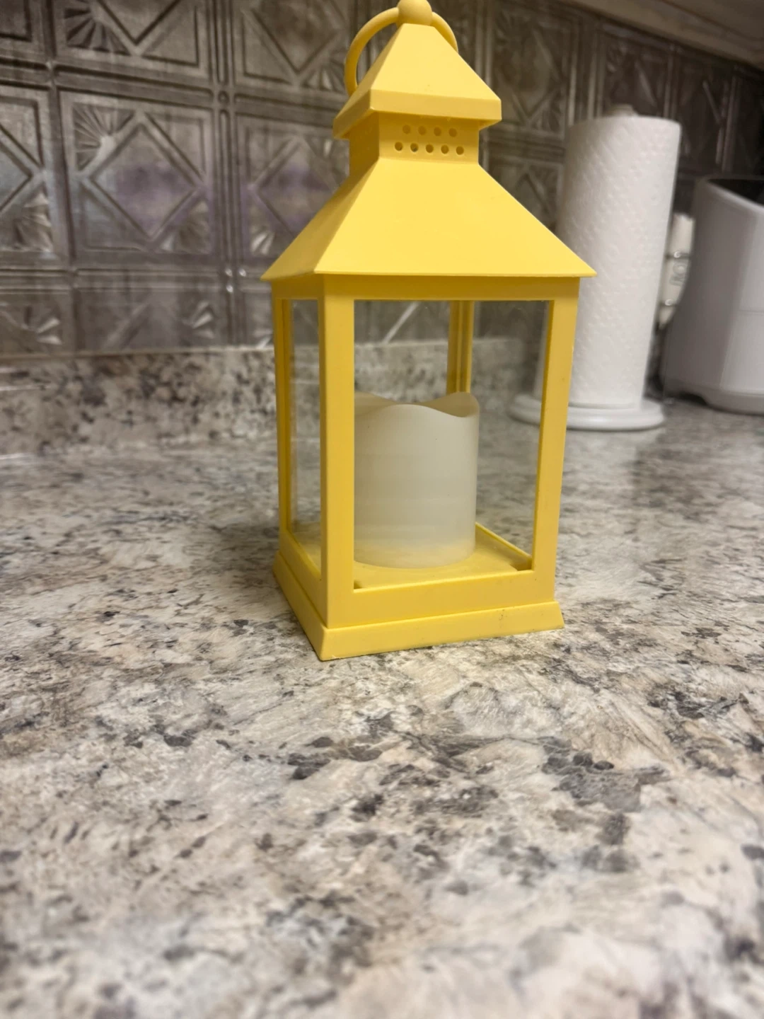 This is a bright yellow decorative lantern. It includes a battery-operated LED candle inside. It's made of metal. This lantern is perfect for adding a cozy glow to any room or outdoor space!