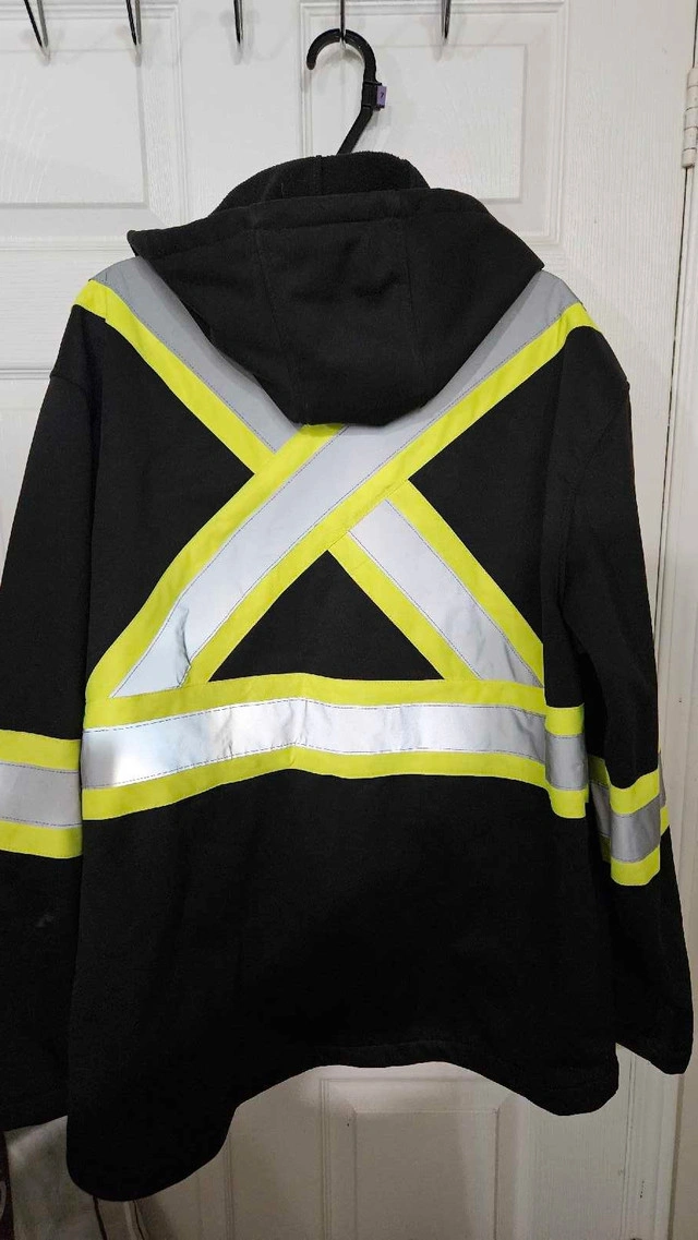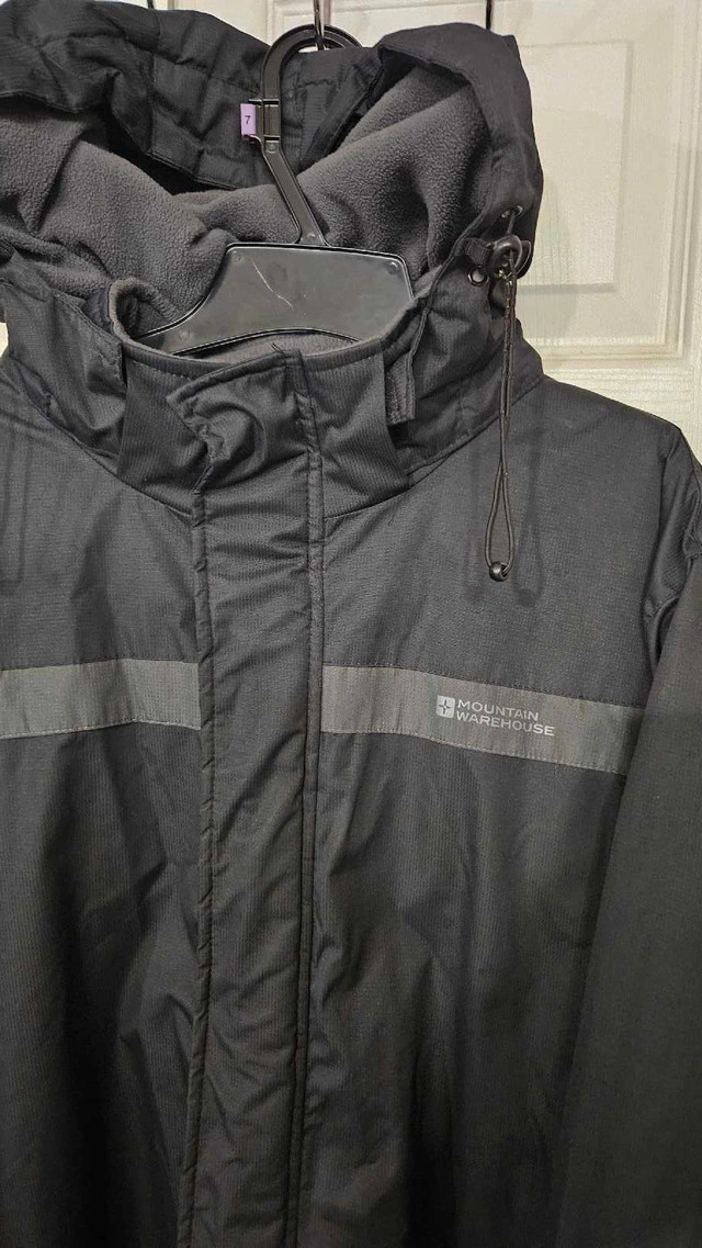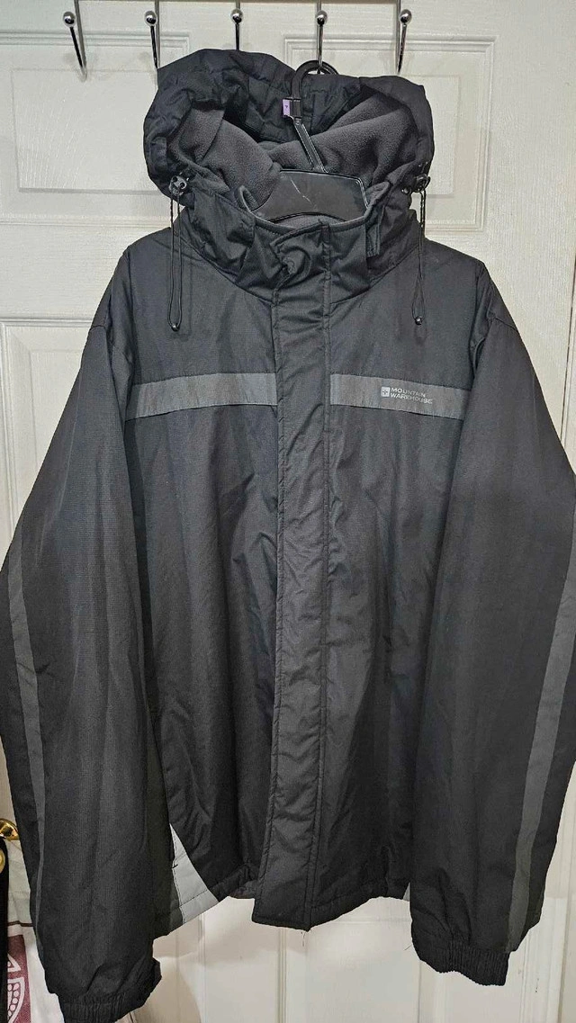 Selling two jackets that are perfect for winter weather conditions! First, a Mountain Warehouse jacket, great for everyday wear, featuring a hood and a comfortable fit. It's in good condition, ready to keep you warm and dry. Secondly, a high-visibility work jacket ideal for outdoor jobs, ensuring you're seen and safe. It also has a hood for extra protection against the elements. This one is also in good condition. Mountain Warehouse Jacket: