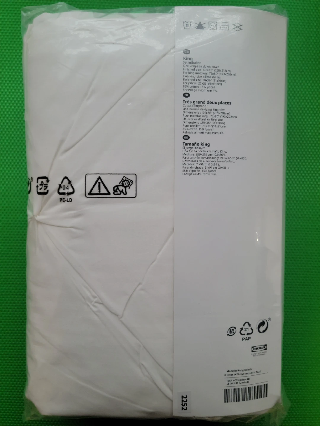 This is a King size duvet cover from IKEA's TRUBBTÅG collection. It's white and made from 100% cotton with a 200 thread count. Includes one duvet cover measuring 250x232 cm and two pillowcases measuring 51x69 cm.