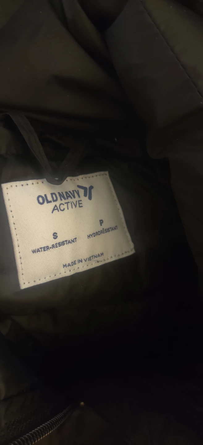 Water-resistant puffer jacket from Old Navy Active. Made in Vietnam. It's a size small.Doesnt have a hood. Great for those not so freezing days