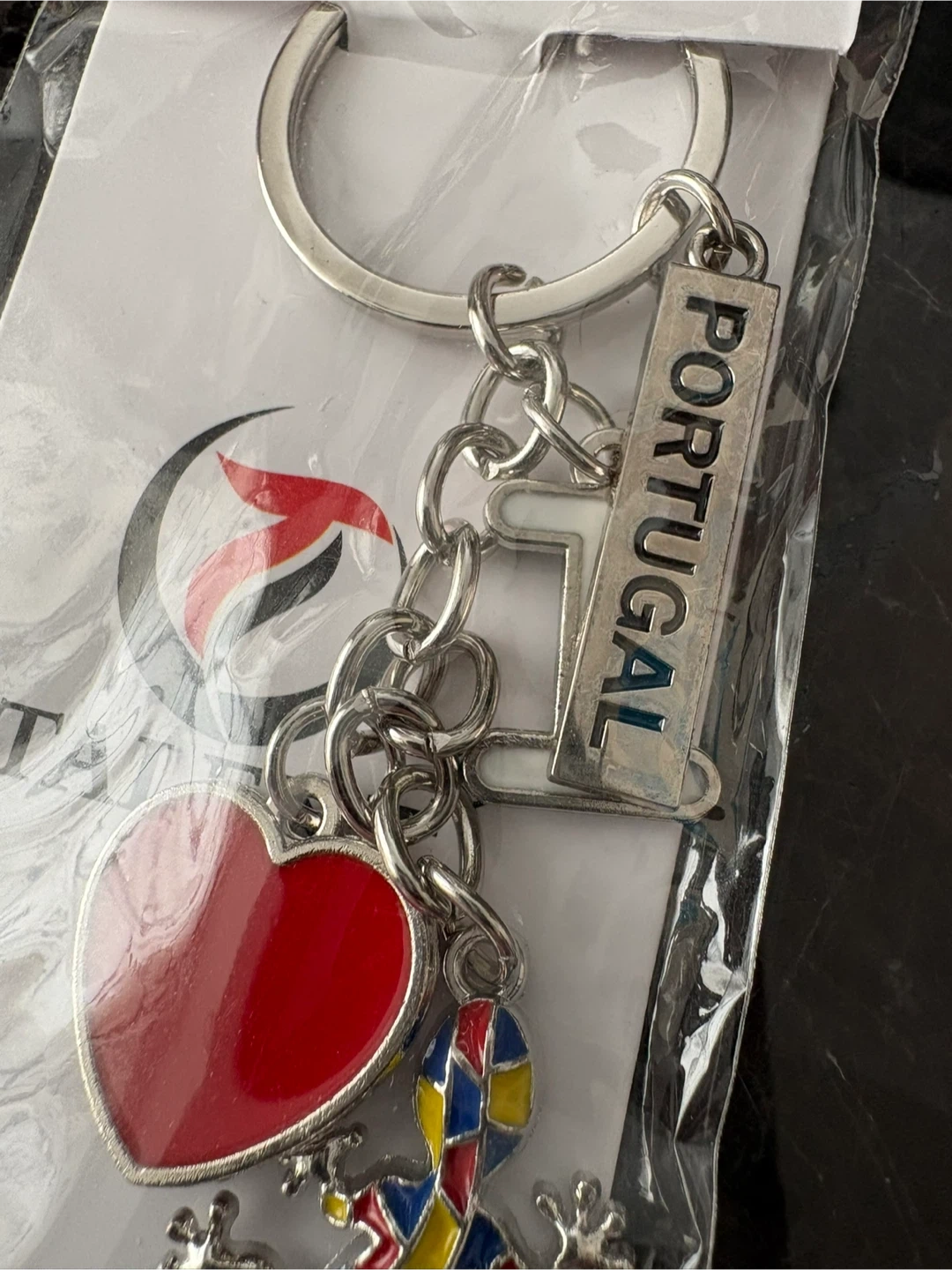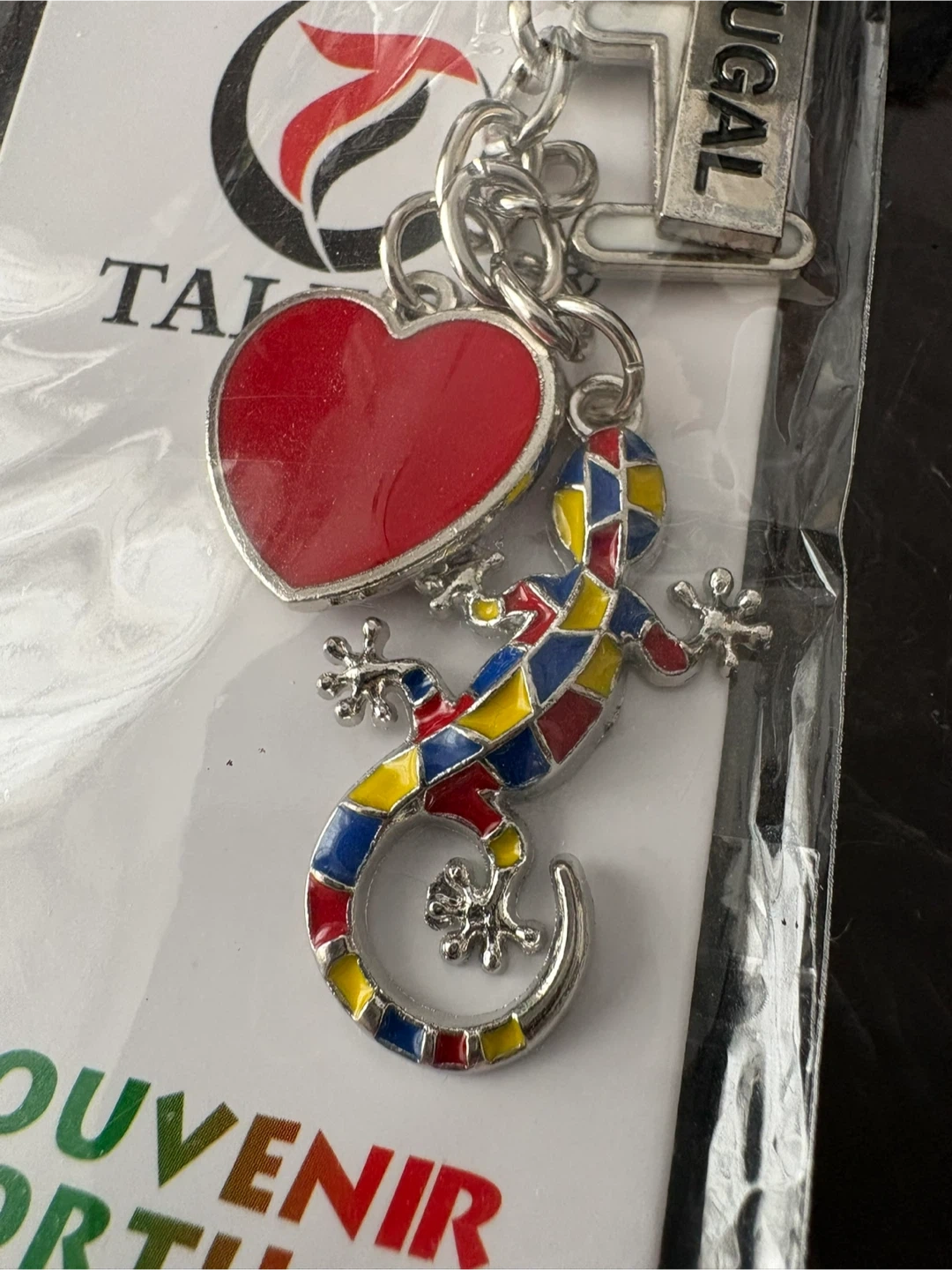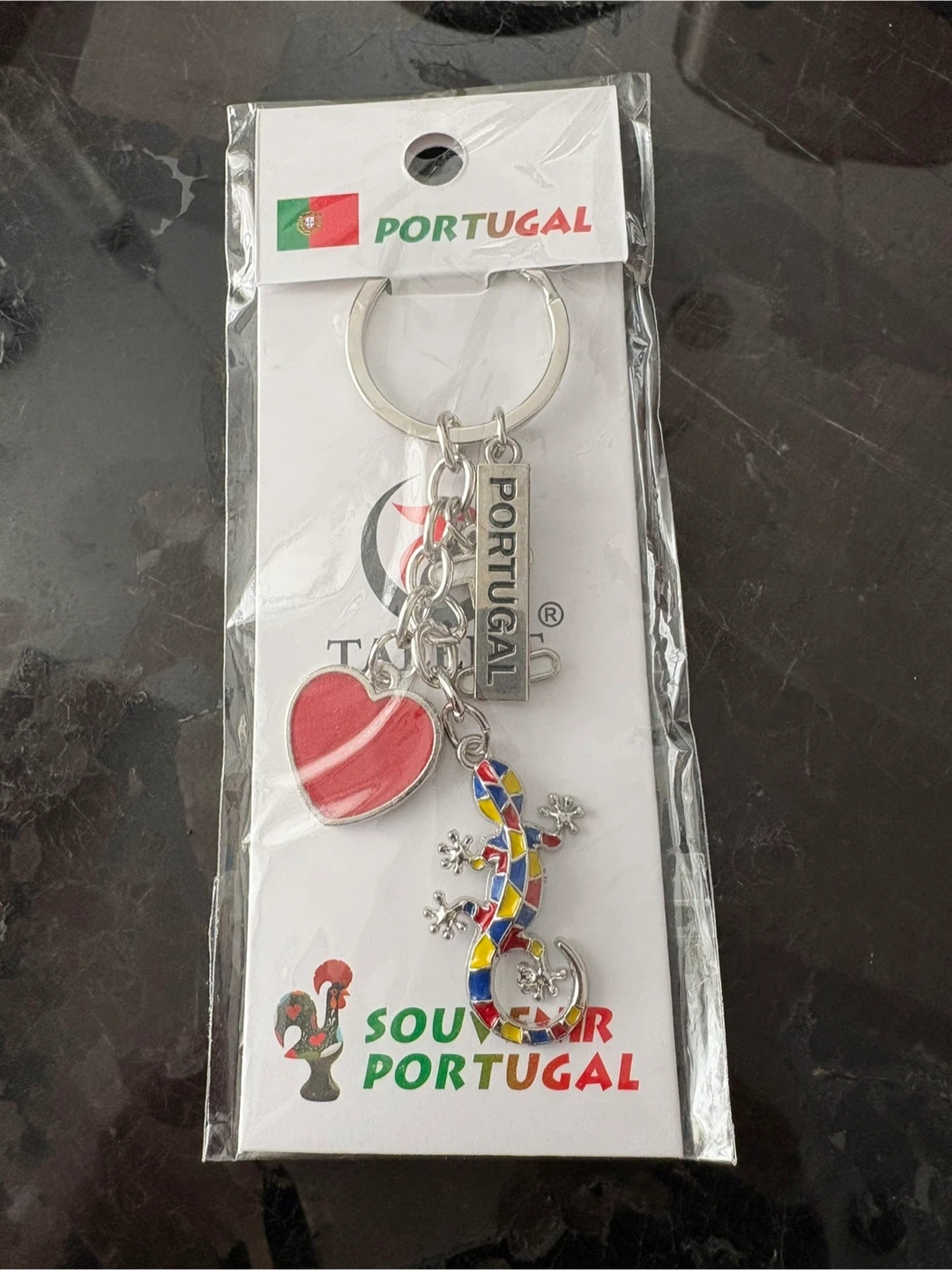 This keychain features charms representing Portugal, including a heart and a colourful lizard. It also includes a "PORTUGAL" tag. A nice memento for travellers or collectors!