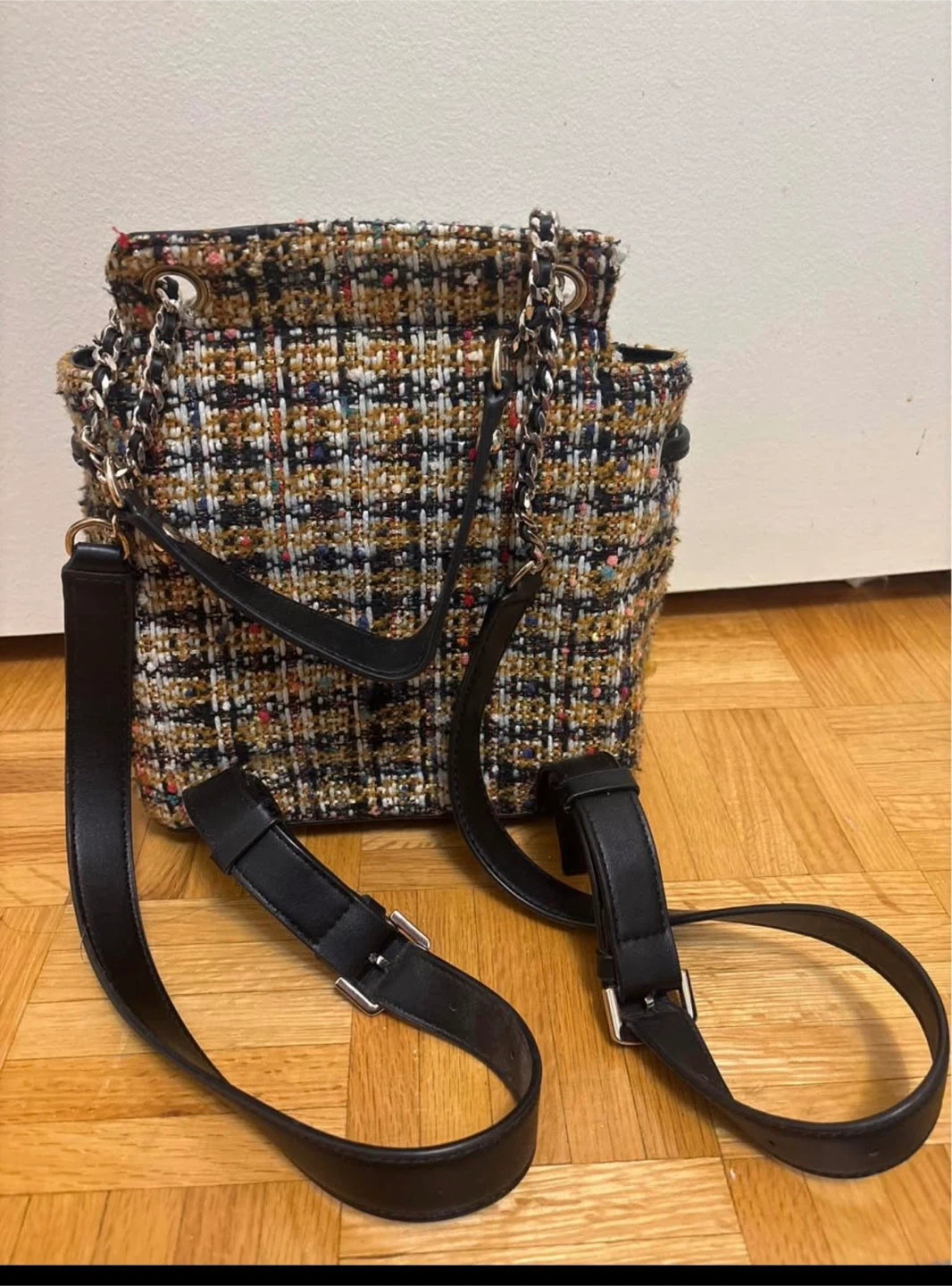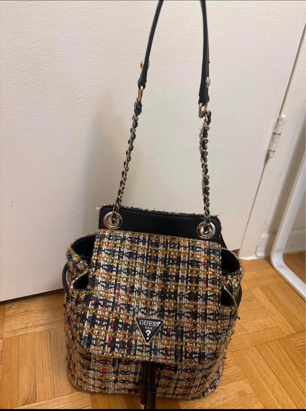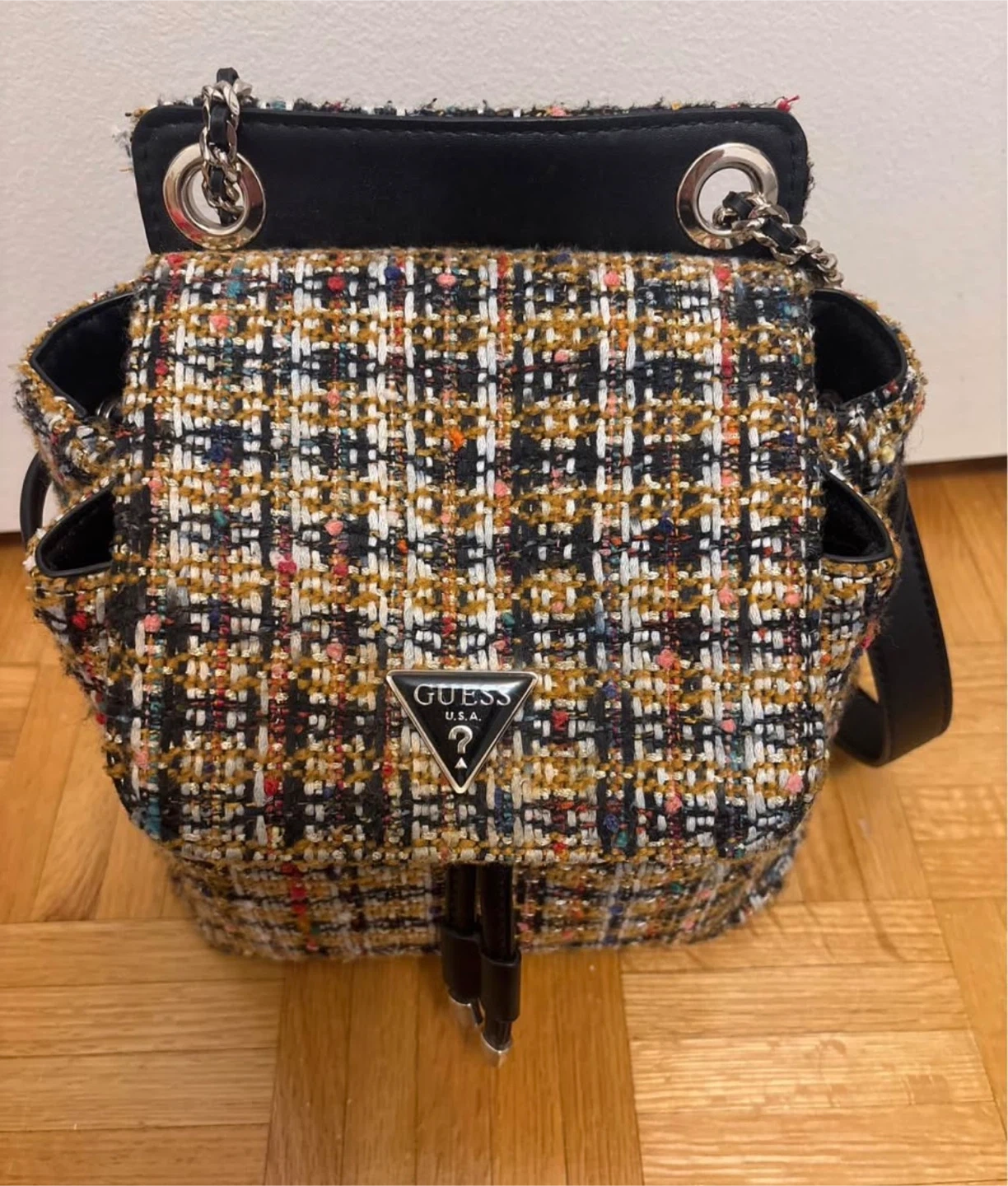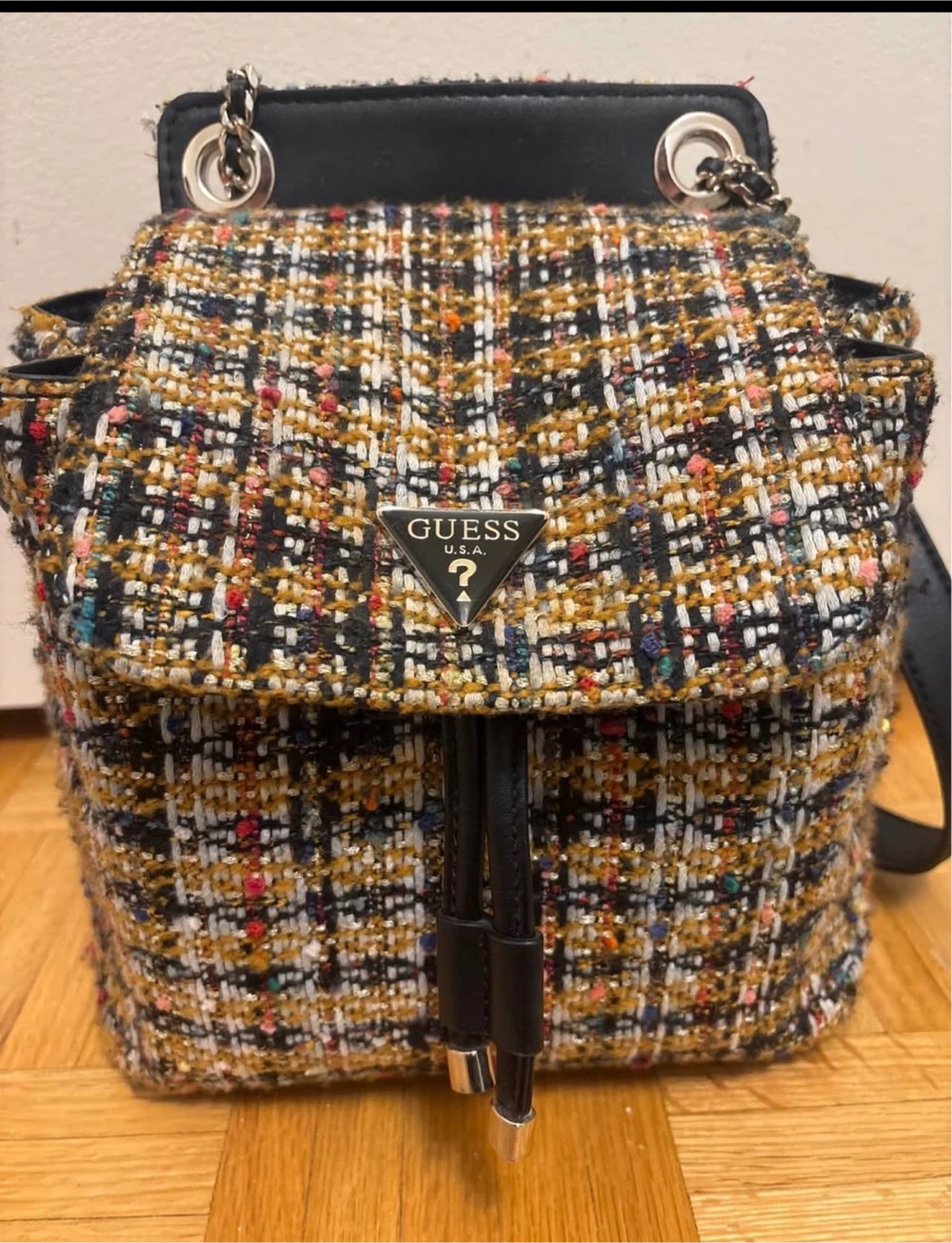 This Guess backpack purse has a stylish tweed exterior with black faux leather trim. It features a drawstring closure and a front flap pocket. Perfect for everyday use!
