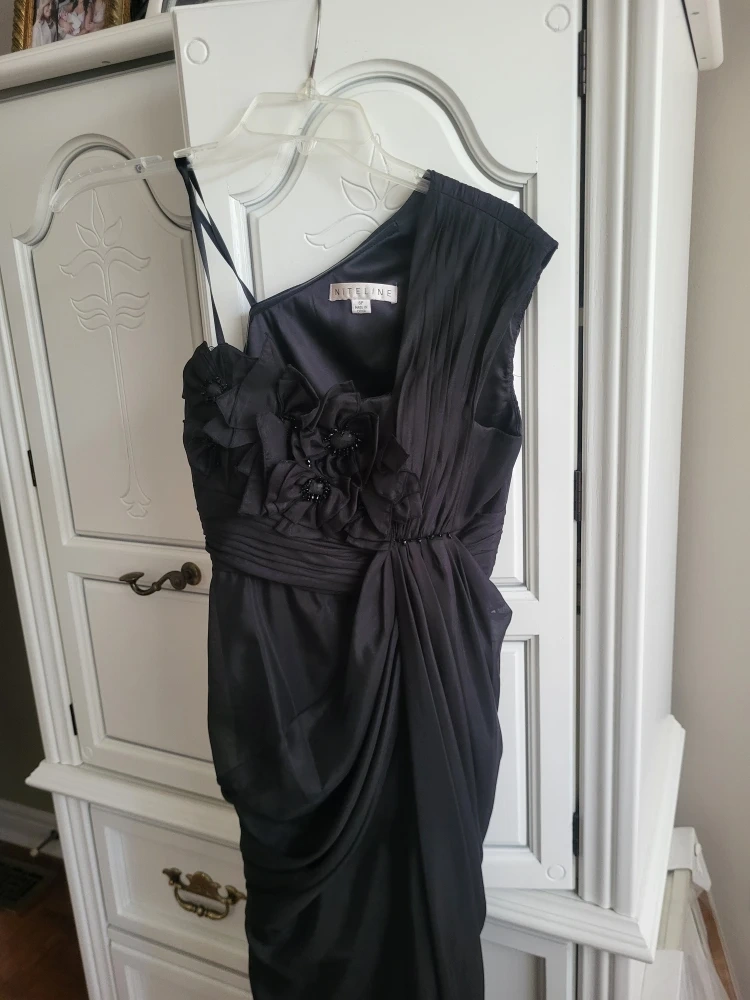 Elegant black one-shoulder dress by Nitelina. It features a beautiful floral applique with bead accents on the bodice and a flattering draped skirt. Size 6. Perfect for special occasions!