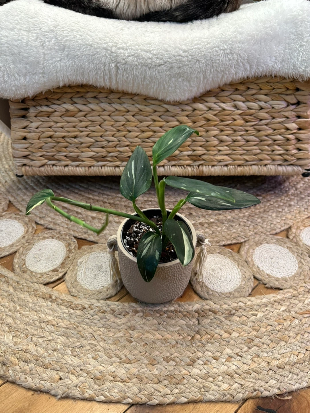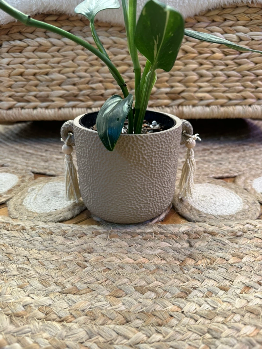 Monstera Cobra Albo (aka Standleyana Albo)features attractive dark green leaves with white and chartreuse variegation. It's potted in a 4” textured beige ceramic pot with decorative tassels.