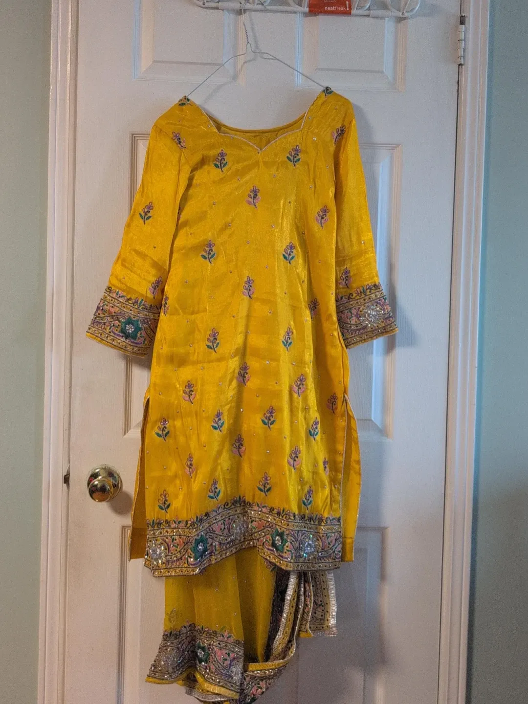 Beautiful yellow kurti with intricate embroidery and sequin detailing. Includes matching pants. Perfect for festive occasions!