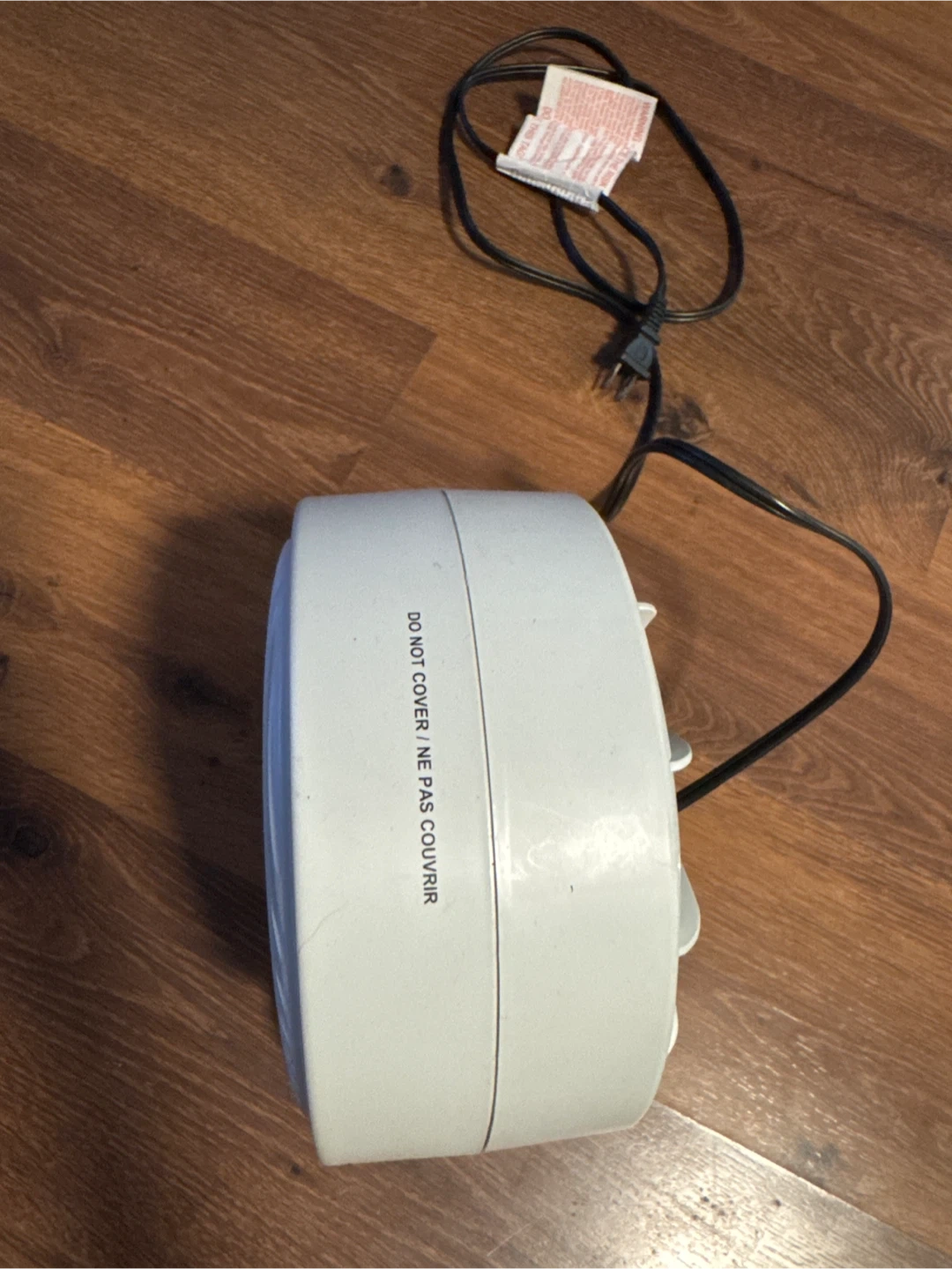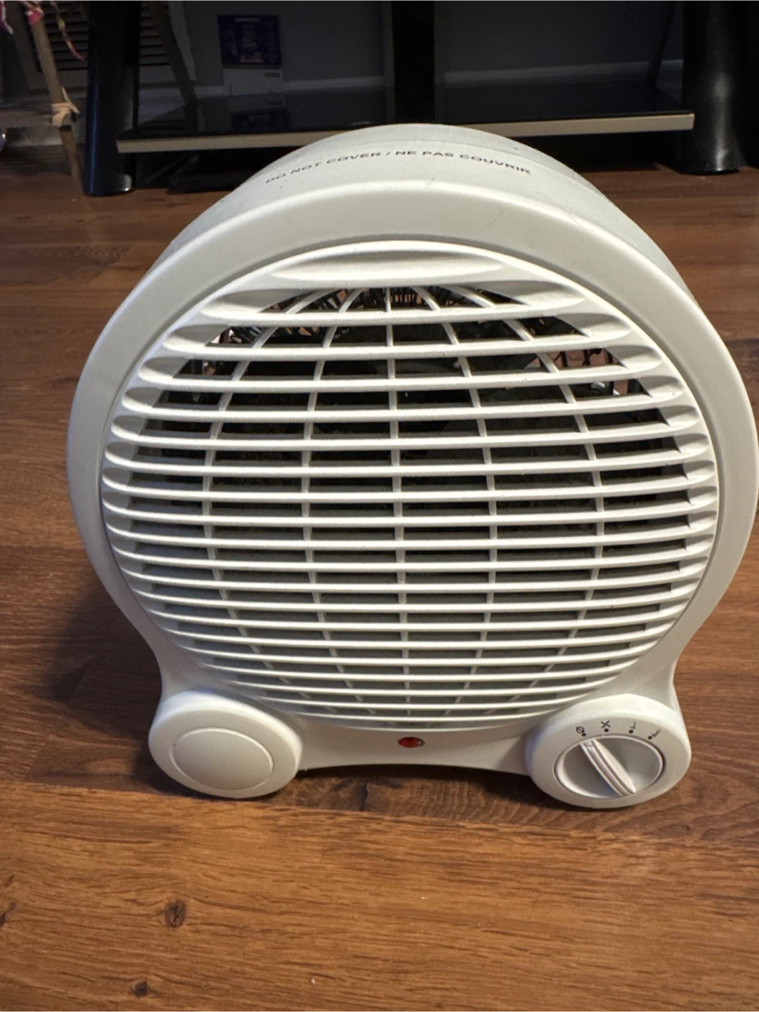 Compact portable electric heater. Features adjustable temperature settings and a safety warning not to cover the unit. It's great for quickly warming up small spaces. Ready for use!