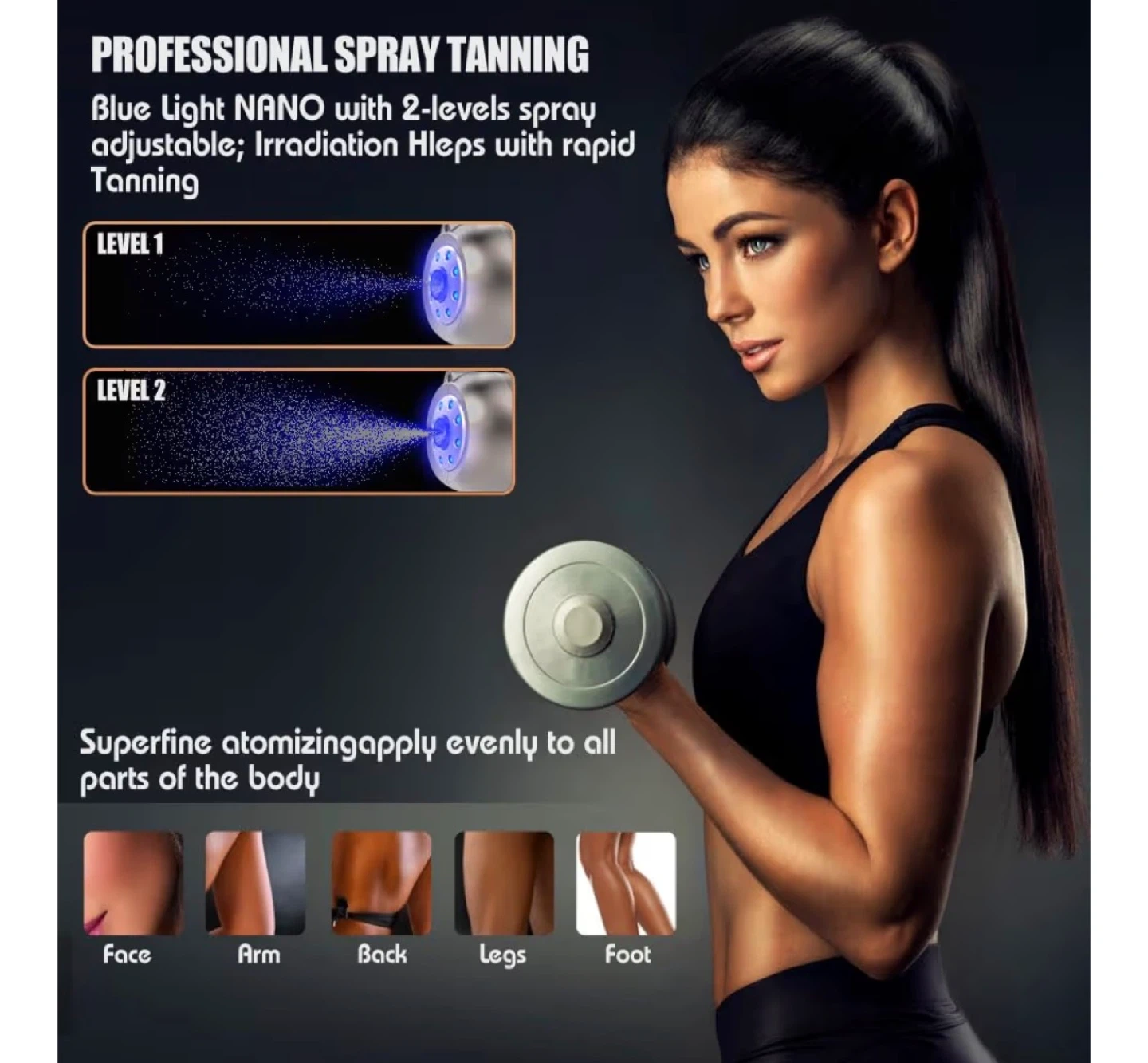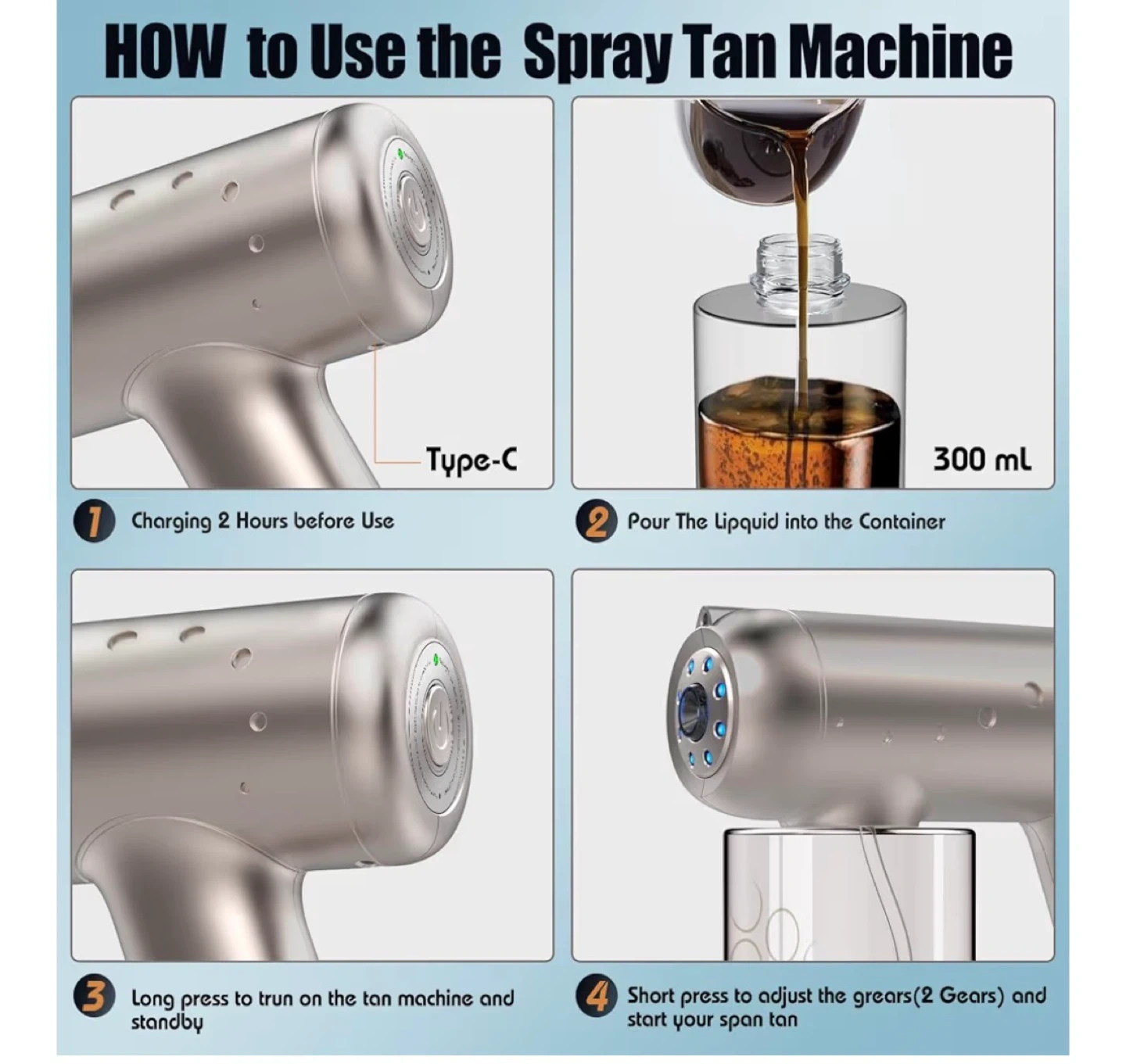 Professional cordless spray tan machine with blue light NANO technology. It features 2 adjustable spray levels for even mist coverage. The container holds 300 ml and it charges via Type-C.