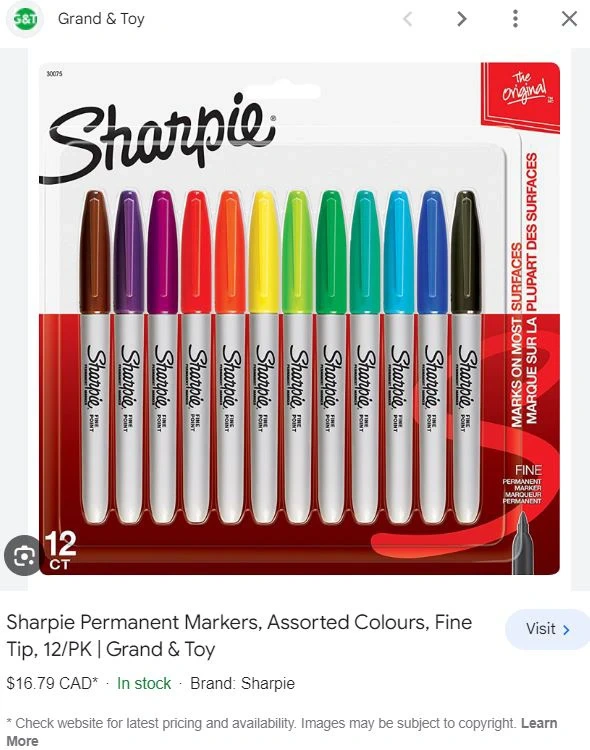 - Grand & Toy Sharpie Permanent Markers, Assorted Colours, Fine Tip, 12 Pack