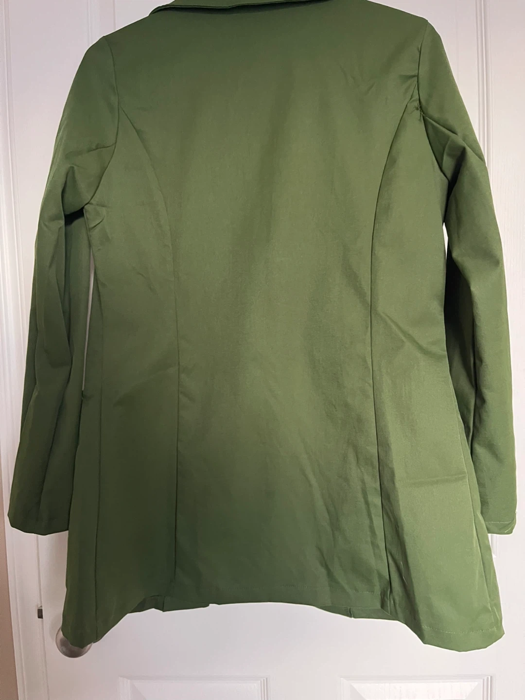 This stylish brand new green utility blazer jacket features a button-up front and four pockets. Made with 95% polyester and 5% elastane. Size S. It's a versatile piece for any wardrobe!