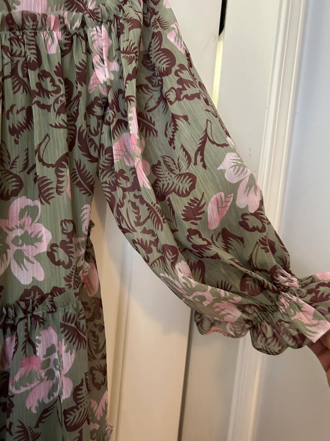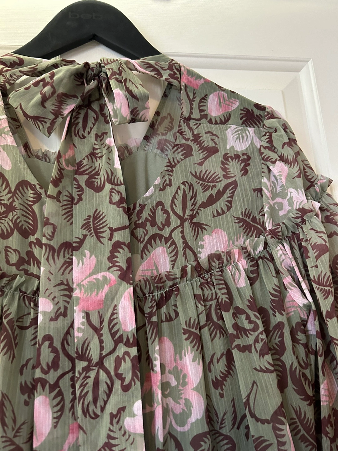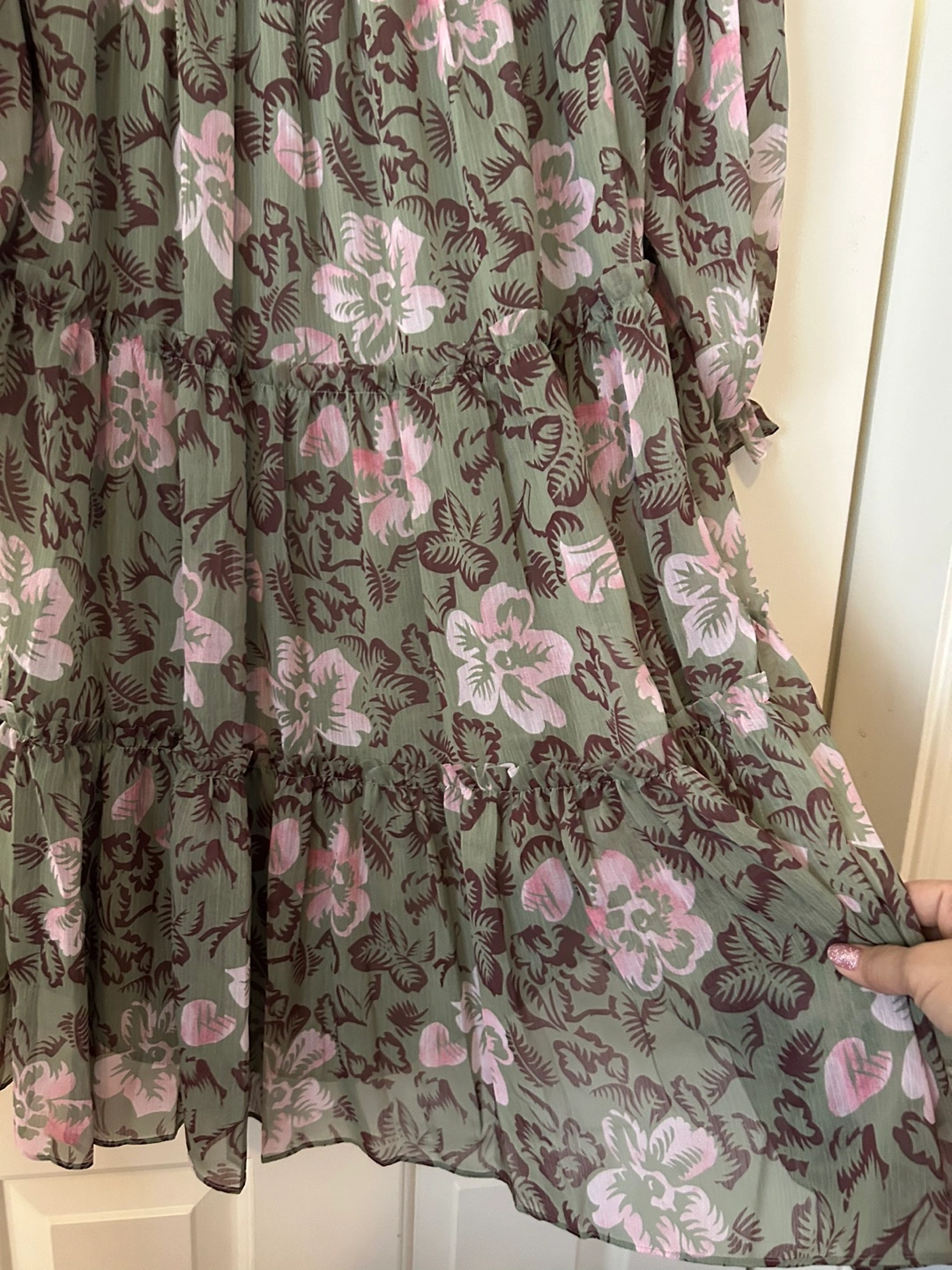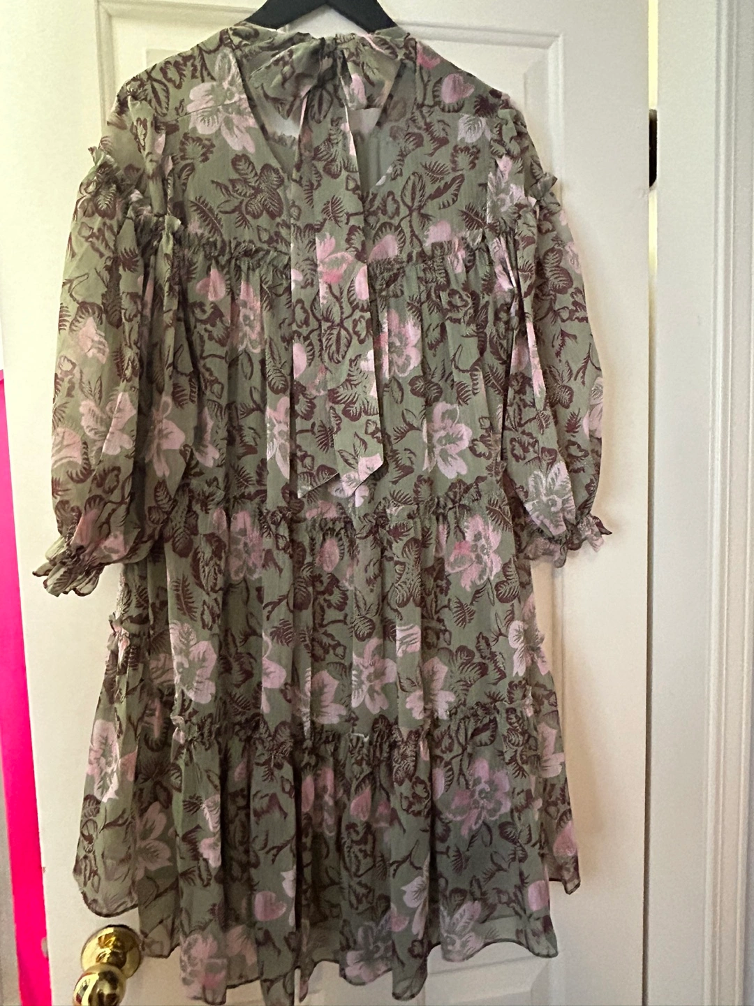 Green and pink floral dress with a tie at the back. Has 3/4 sleeves and a tiered skirt.