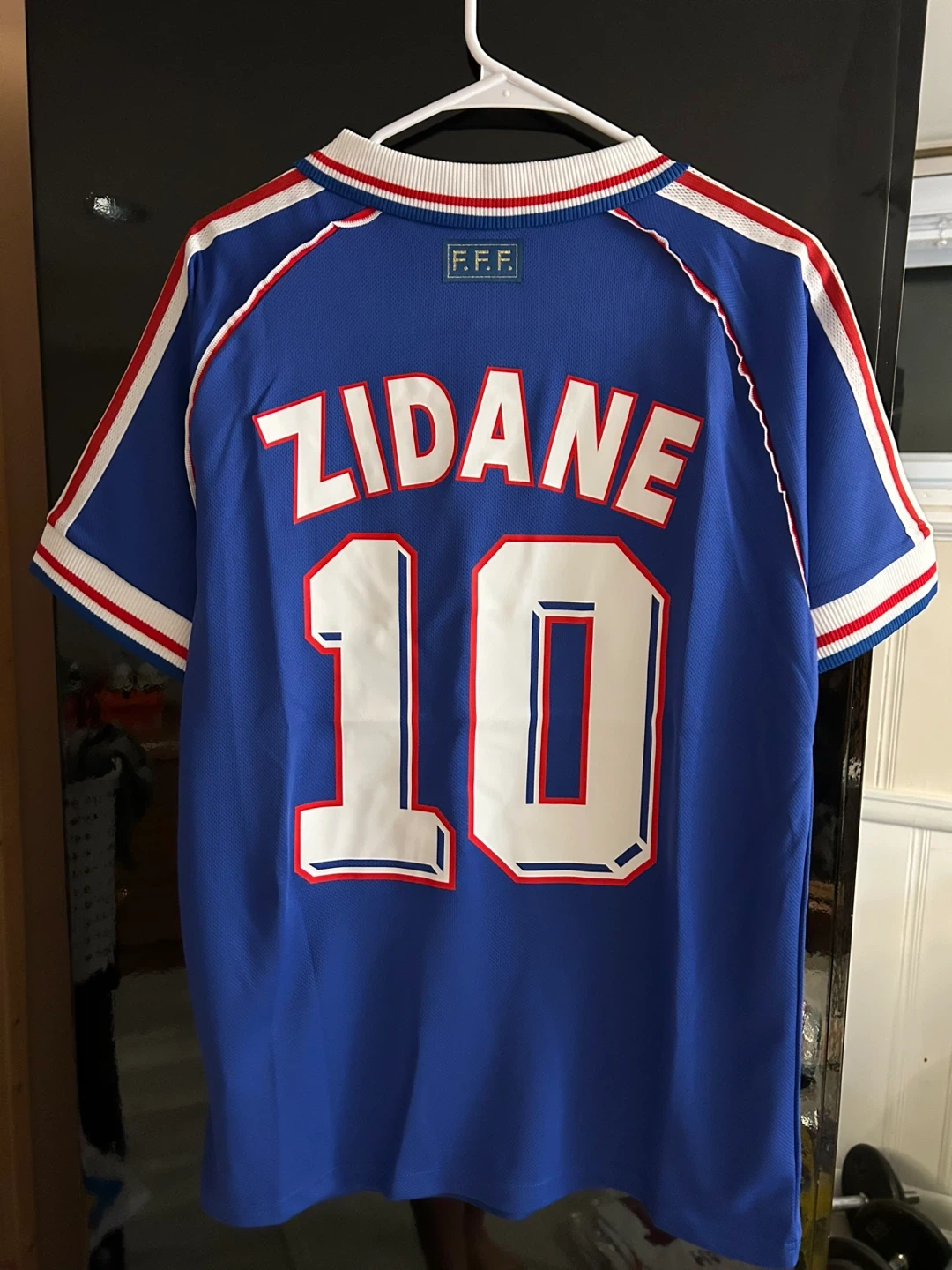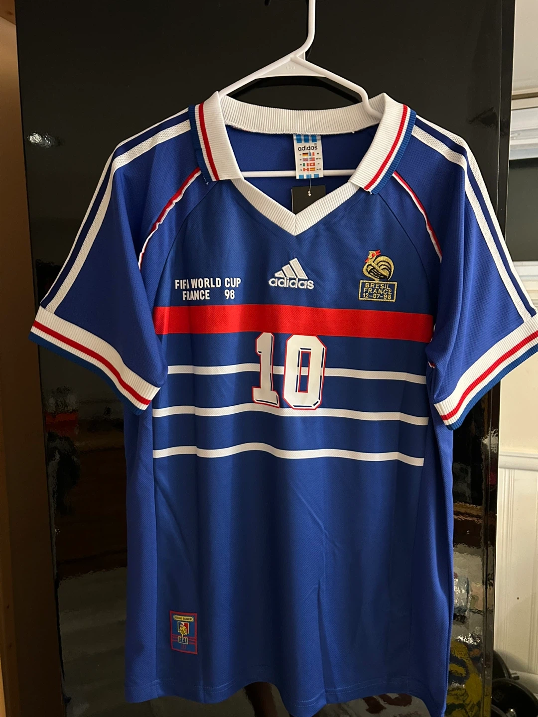 This is a classic Adidas France national team soccer jersey from the 1998 FIFA World Cup. It features the iconic number 10 and Zidane's name on the back. Polyester fabric construction.