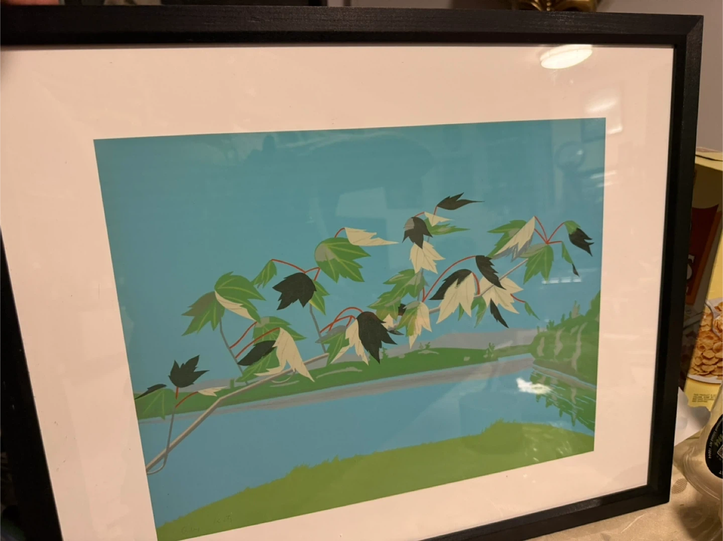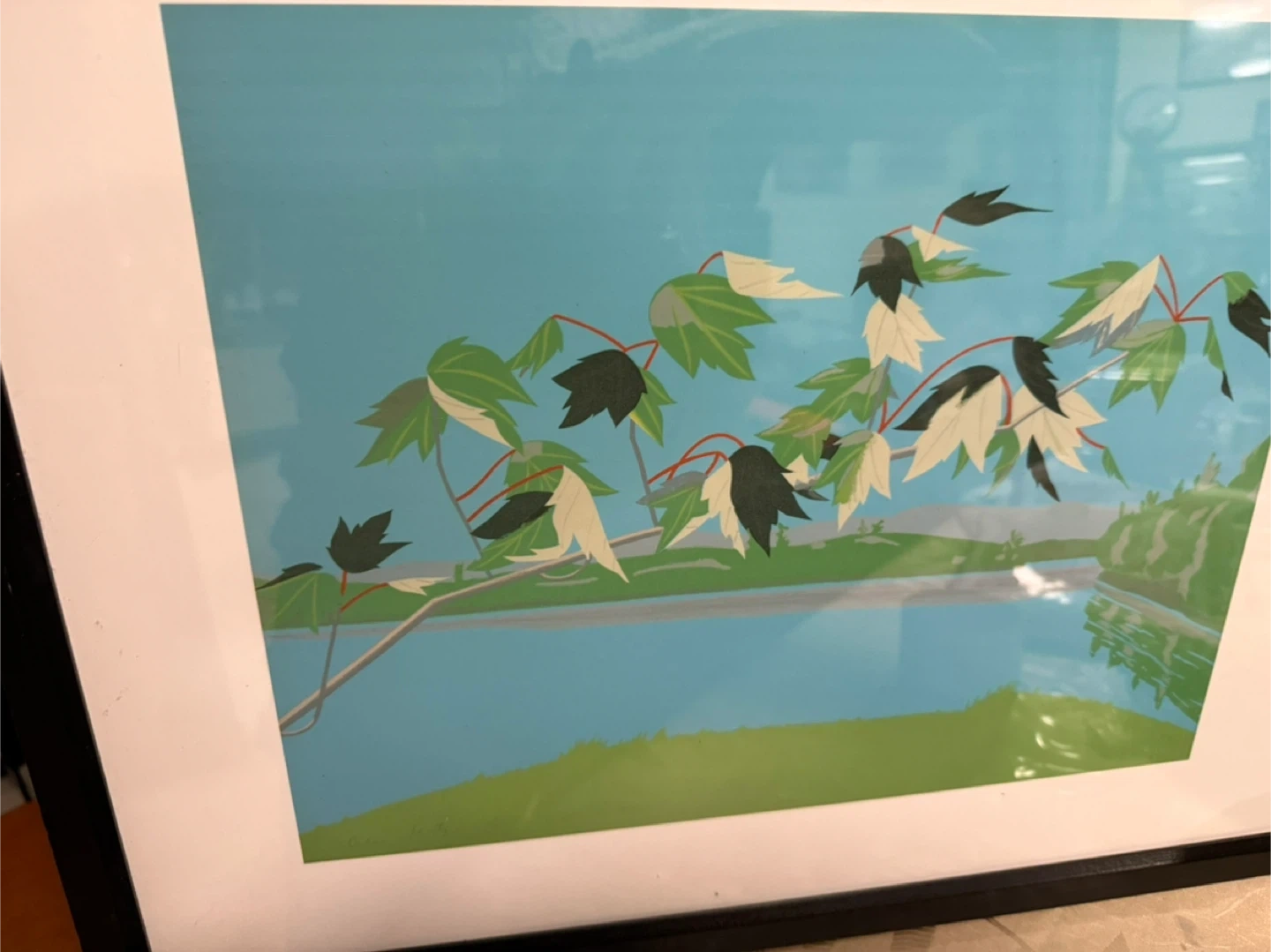 Art print featuring a stylized branch with leaves against a bright blue sky and water scene. Includes a black frame and white matting. Ready to hang!