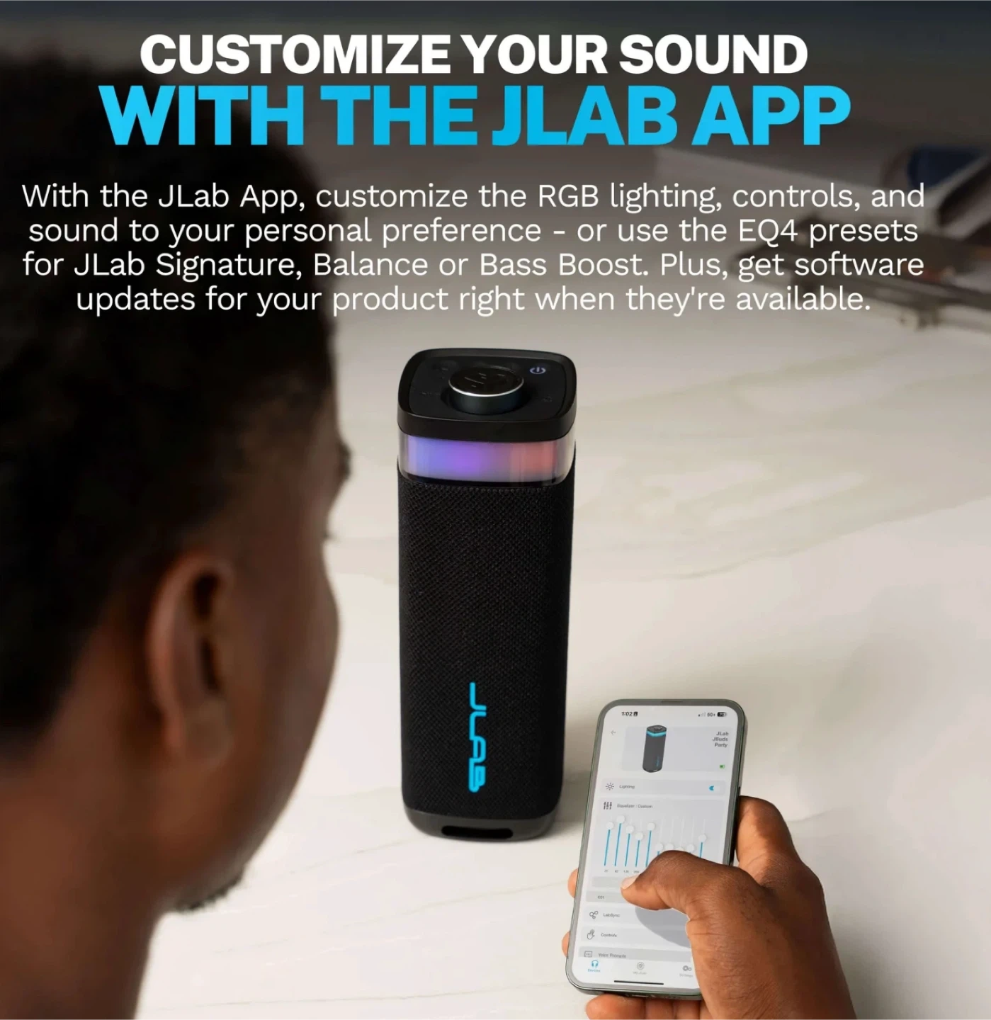 The speaker is a portable Bluetooth speaker with RGB lighting that you can customize via the JLab App. It also has dual 2.5" full-frequency drivers and two 2" passive woofers with 30 watts of power for room shaking sound!