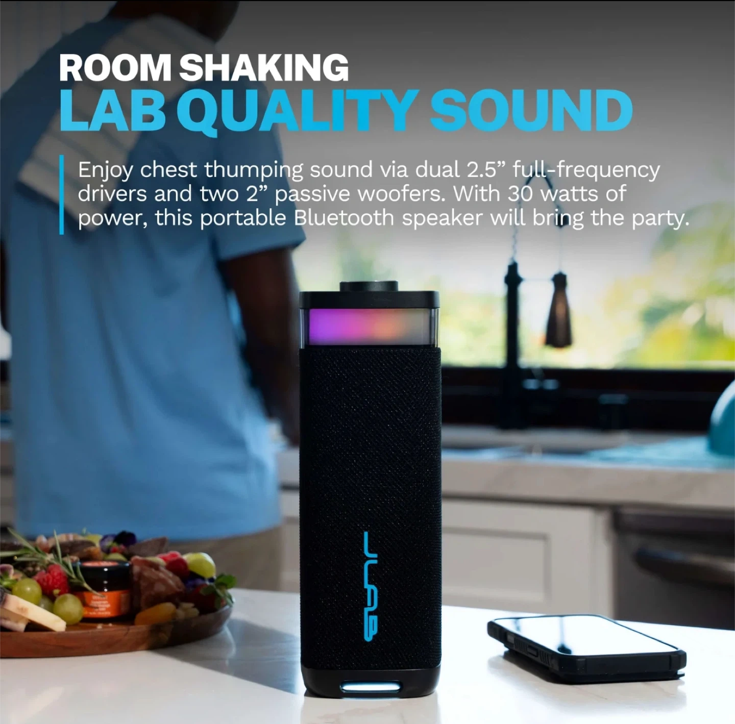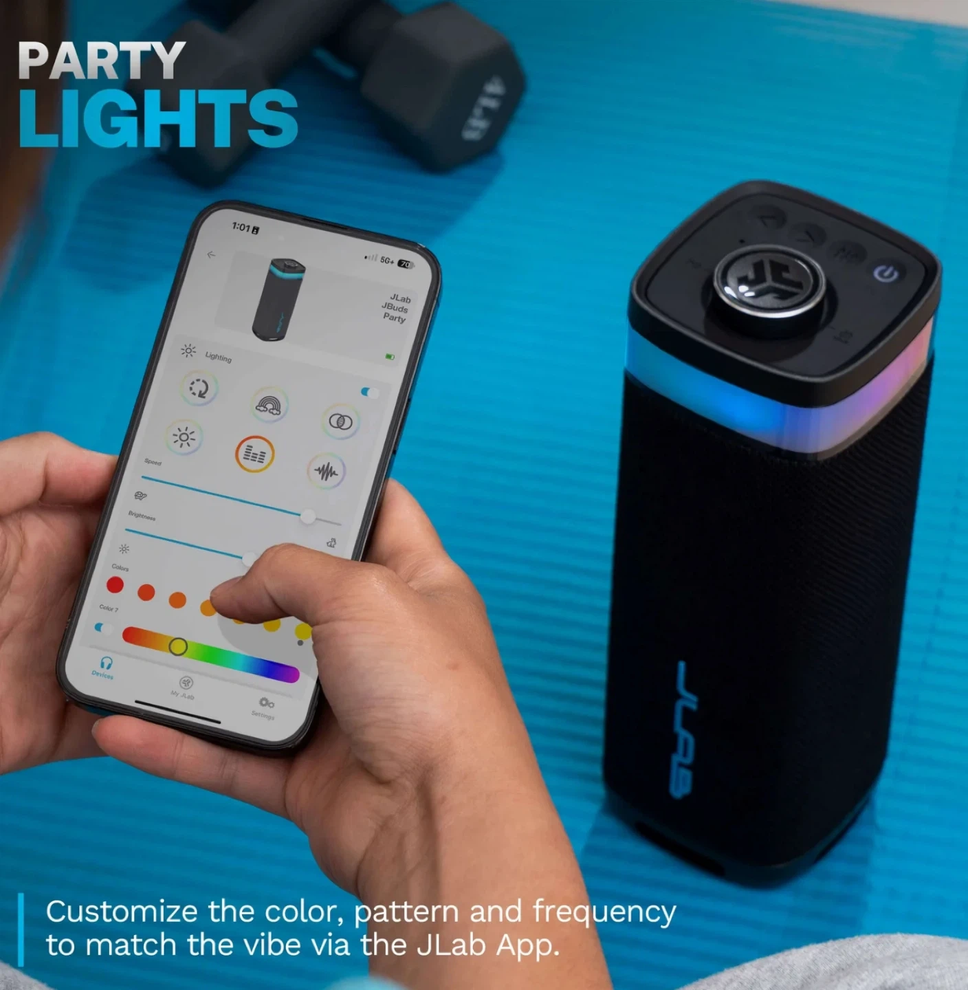 The speaker is a portable Bluetooth speaker with RGB lighting that you can customize via the JLab App. It also has dual 2.5" full-frequency drivers and two 2" passive woofers with 30 watts of power for room shaking sound!