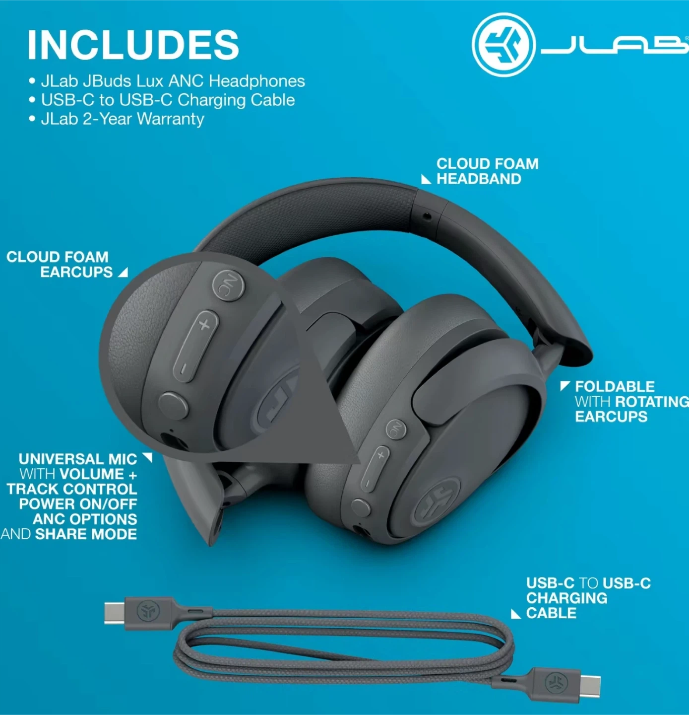 The headphones feature cloud foam earcups and headband, a universal mic with volume and track control, power on/off ANC options, and share mode. They also come with a USB-C to USB-C charging cable.