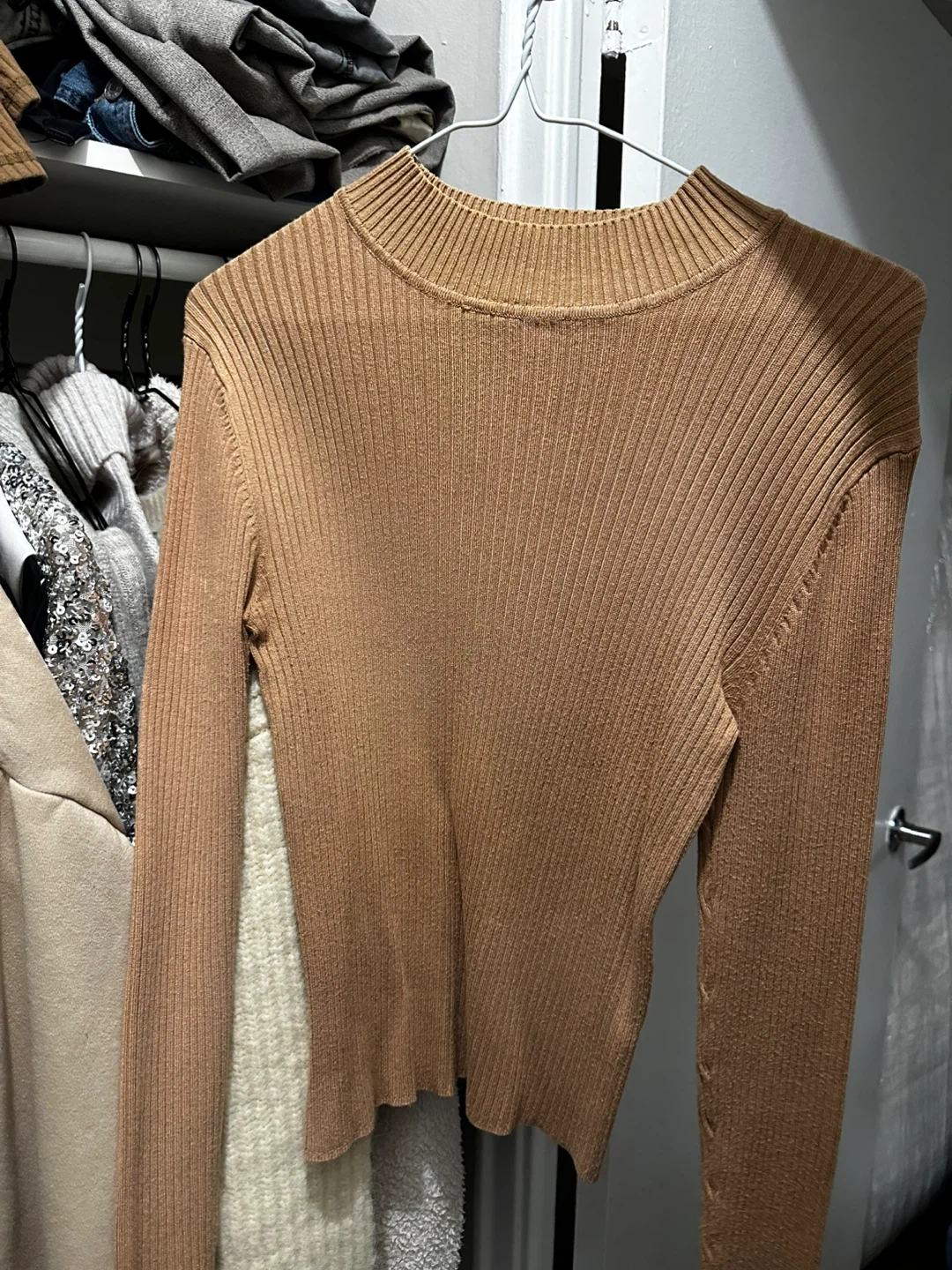 Here's a ribbed knit long sleeve top in a lovely brown colour. It's in great condition and ready for a new wardrobe addition