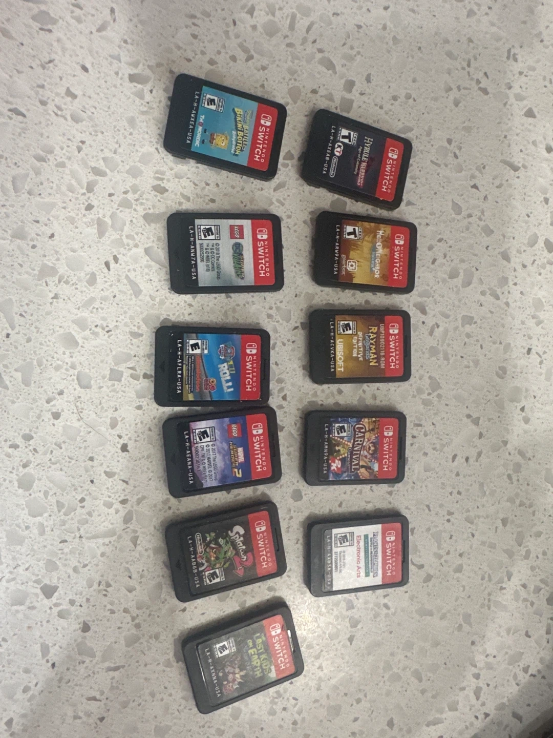 Bundle of nine Nintendo Switch game cartridges. Includes Hyrule Warriors, Hello Neighbor, Rayman Legends, Carnival, SpongeBob SquarePants: Battle for Bikini Bottom, LEGO Marvel Super Heroes 2, Splatoon 2, Plants vs. Zombies, and The Last Kids on Earth. Games are for Nintendo Switch.🥕