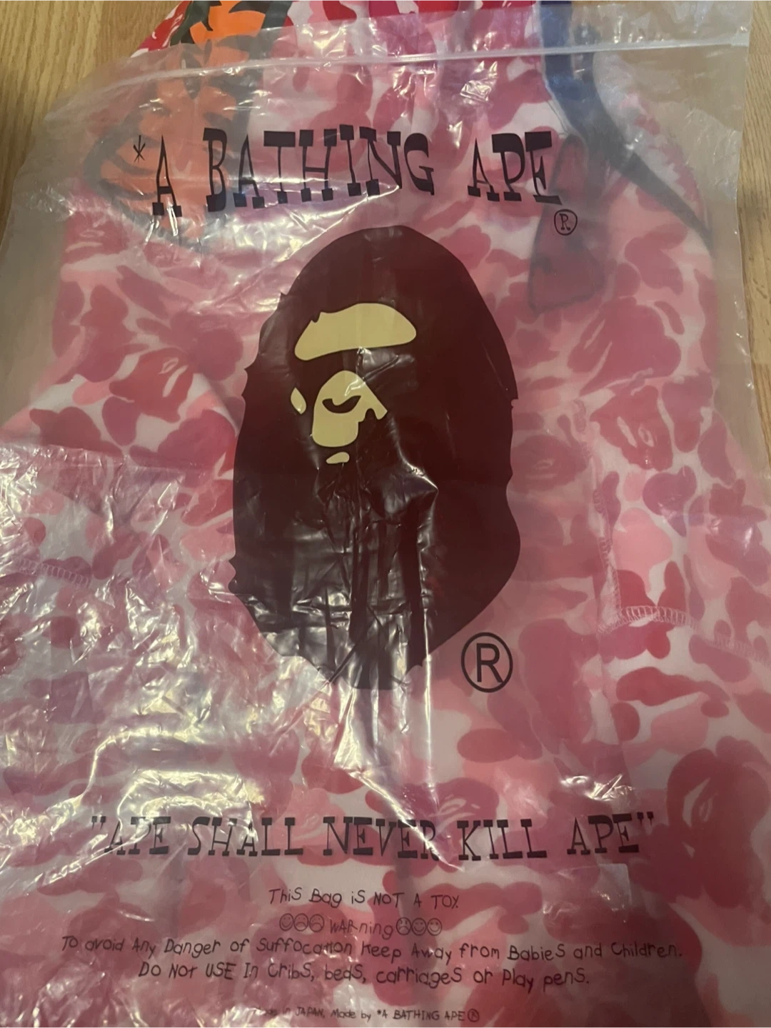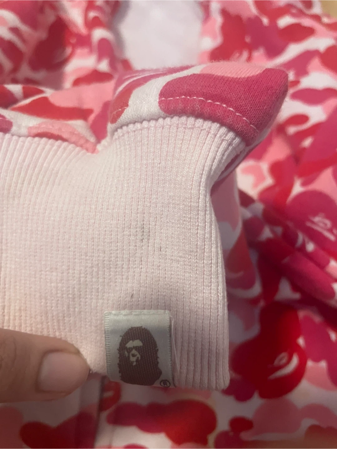 This is an A Bathing Ape full zip hoodie in a pink camouflage pattern. It's made of a soft material for comfort. The hoodie comes in size medium and includes the original packaging bag.