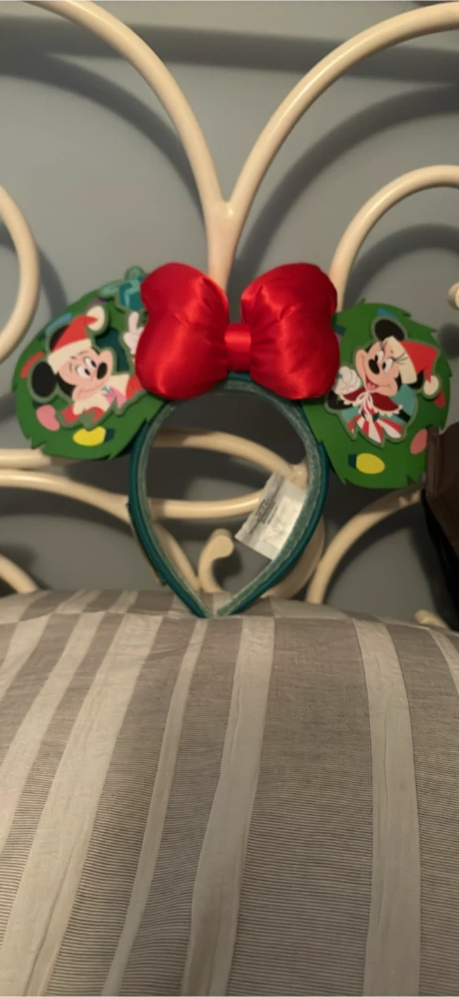 Festive Minnie Mouse ears headband with a red bow and holiday-themed character graphics. Features Mickey and Minnie in Santa hats.