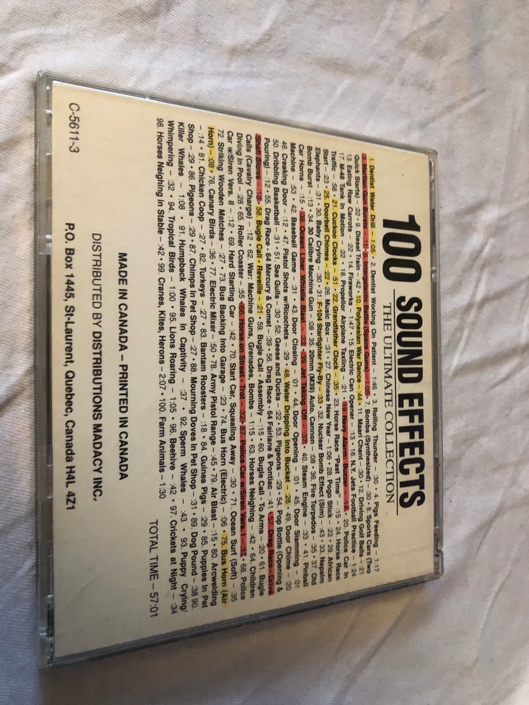 Selling a CD titled '100 Sound Effects - The Ultimate Collection'. It features a variety of sound effects, from animals to machines, perfect for sound design or just for fun!