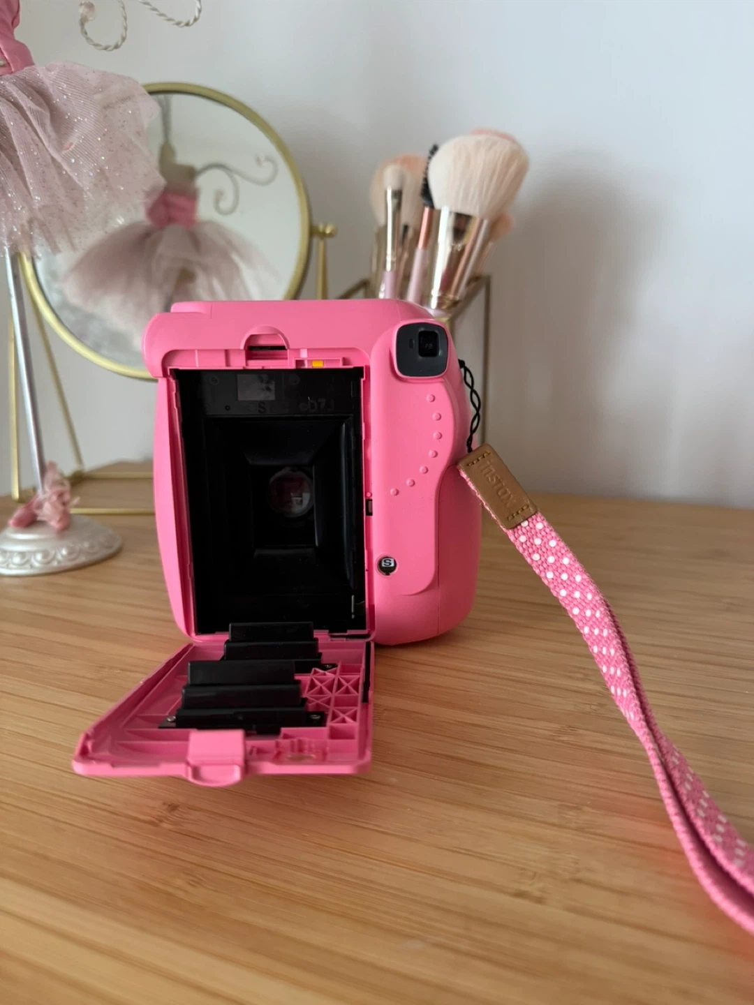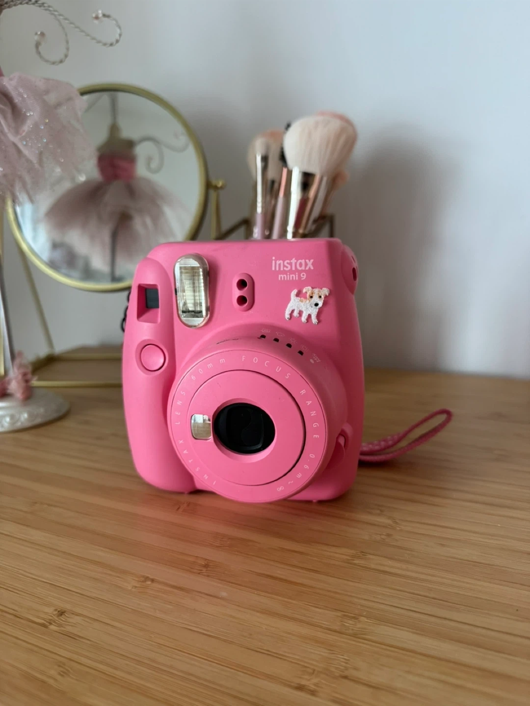 This is a pink Fujifilm Instax Mini 9 instant camera. It's a fun way to capture memories and get instant prints! It's ready for your next adventure.