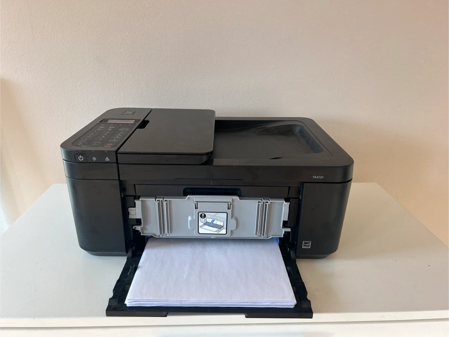 This is a black Canon PIXMA TR4720 all-in-one printer. It's capable of printing, scanning, and copying. Comes with paper loaded in the tray. Great for home or office use!