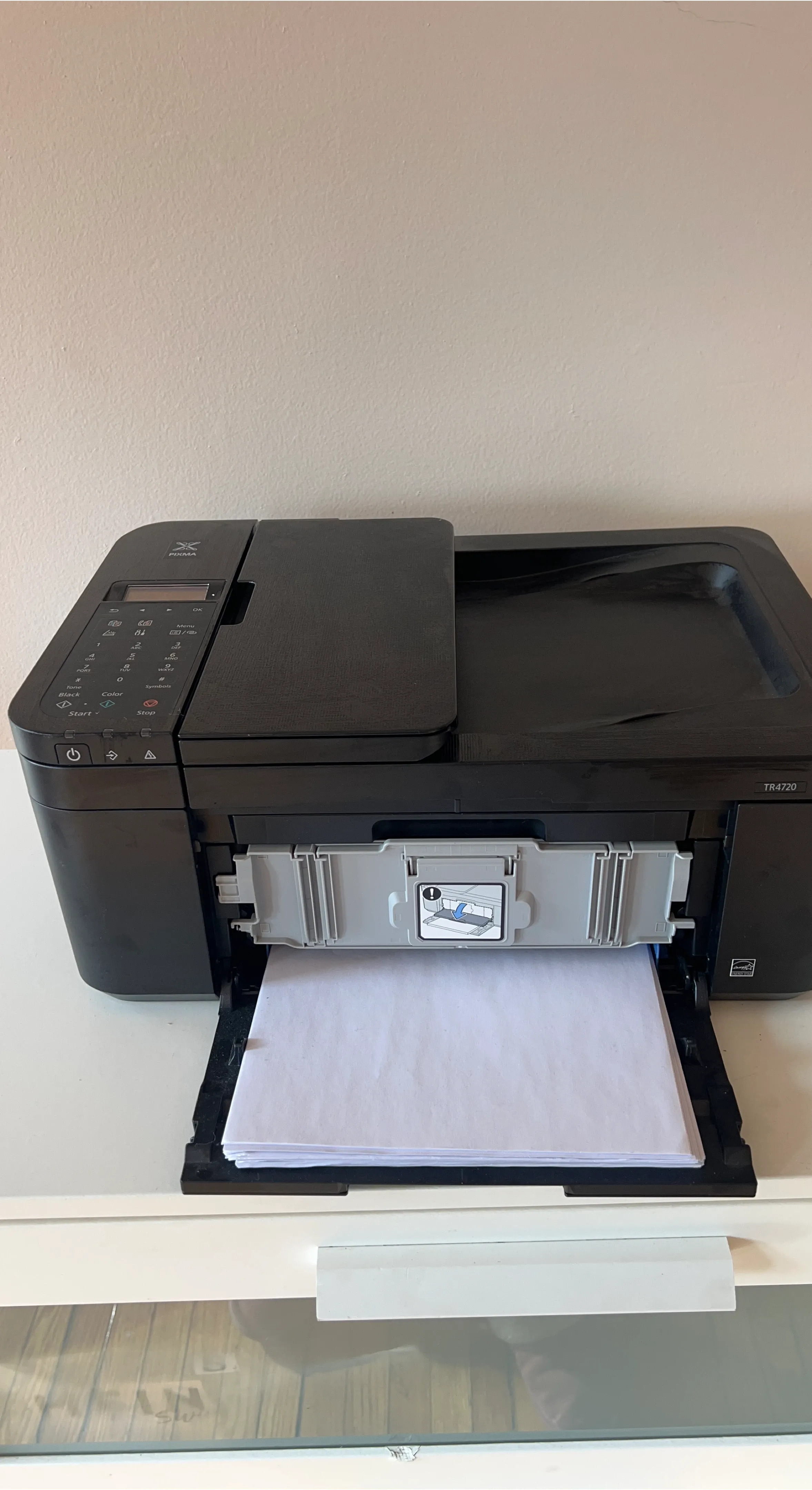 This is a black Canon PIXMA TR4720 all-in-one printer. It's capable of printing, scanning, and copying. Comes with paper loaded in the tray. Great for home or office use!