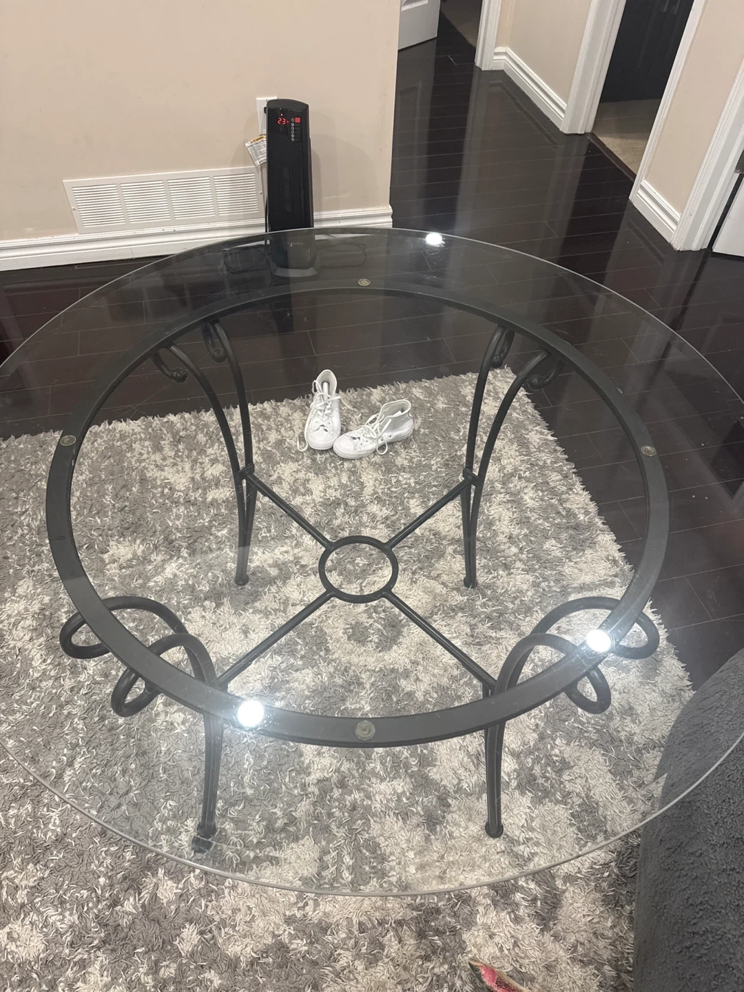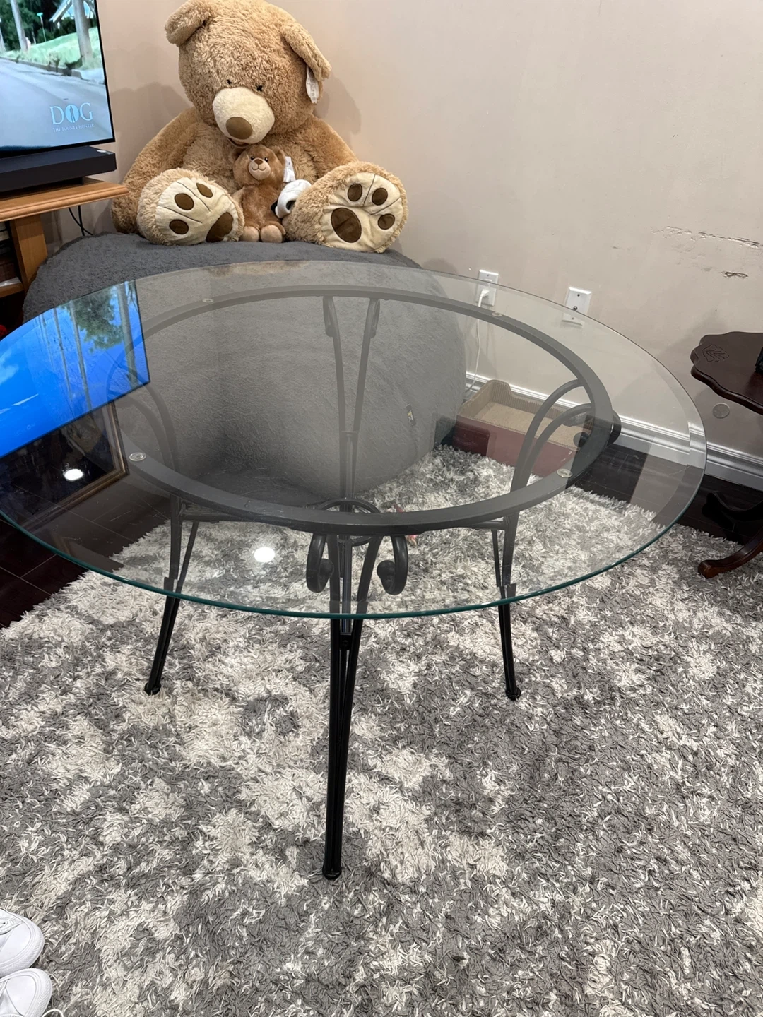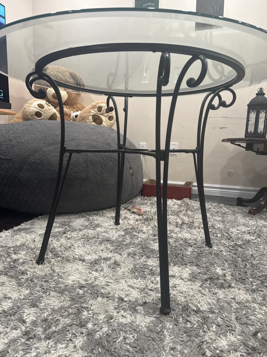 This is a round glass top dining table with a decorative black metal base. It's a nice size for a breakfast nook or smaller dining area. Sturdy construction!