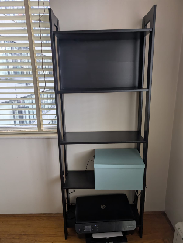 Tall black bookshelf. Five shelves, sturdy frame. Great for organizing books, files, or displaying decor. Minimalist design, simple assembly.