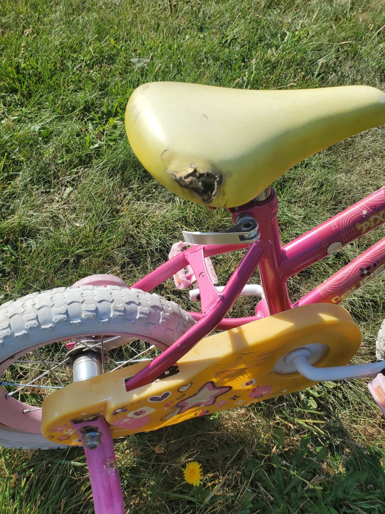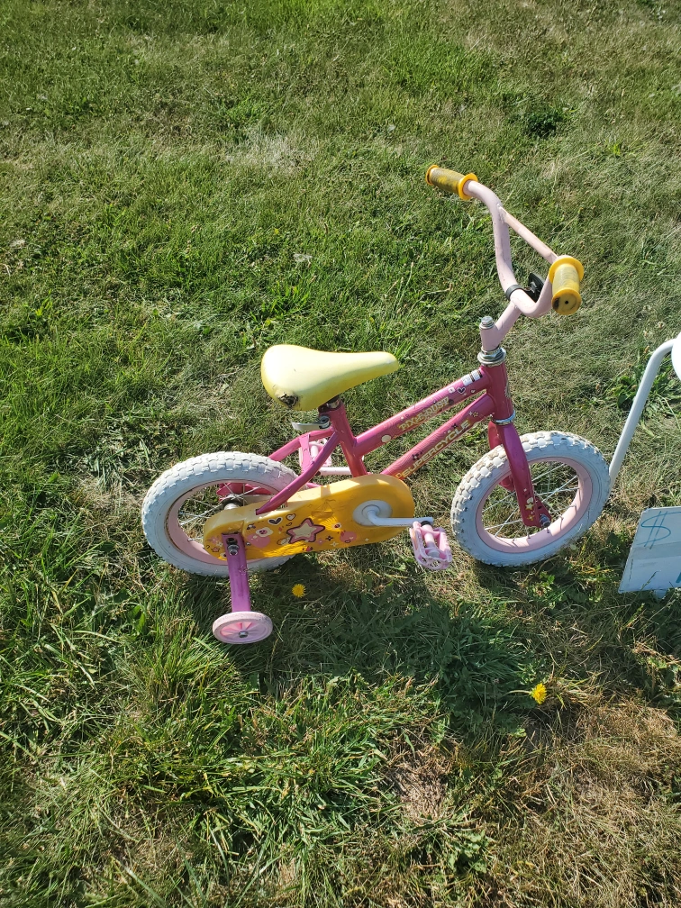 Selling a used pink kids bike. It has some wear and tear, especially on the seat, but is still functional. Perfect for a young child learning to ride with the included training wheels. The tires are size 12 1/2 x 2.25