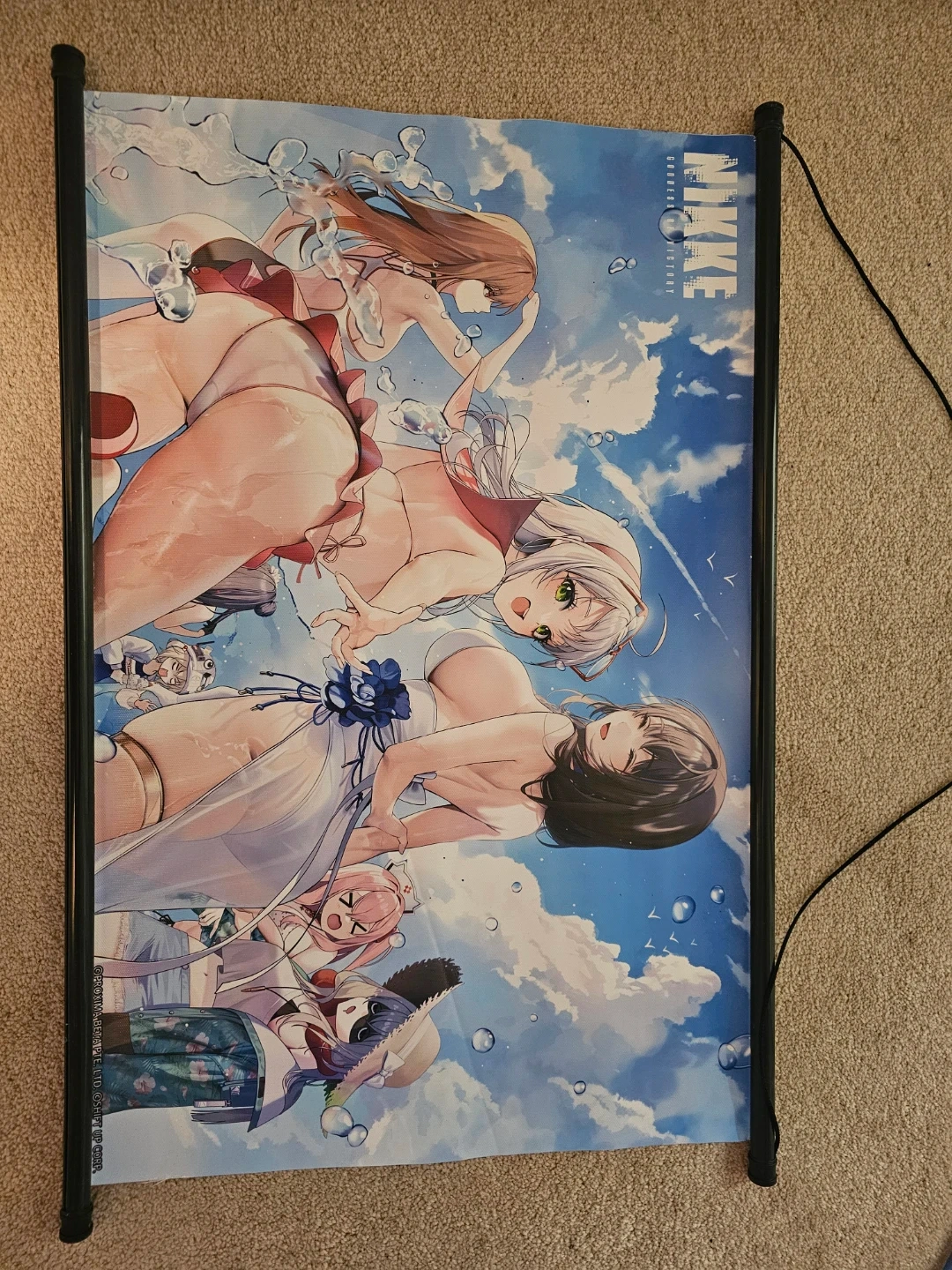 This is a wall scroll featuring artwork from NIKKE Goddess Victory. It's made of fabric and includes a hanging rod with a string. The artwork depicts several characters in a summer-themed setting.