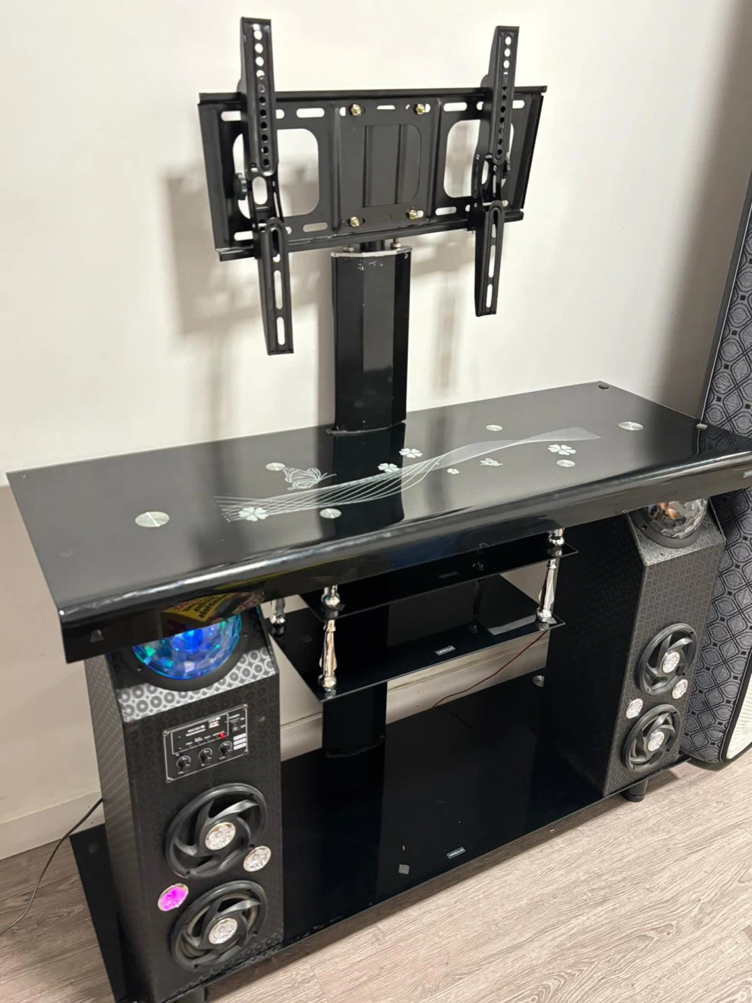 Selling a black TV stand that comes with a built-in mount and speakers. It's in great condition and ready to use! The stand has a sleek design with a glass top and open shelving for your media devices. The speakers are integrated into the sides of the stand for a clean look and enhanced audio experience. Perfect for any living room or entertainment area