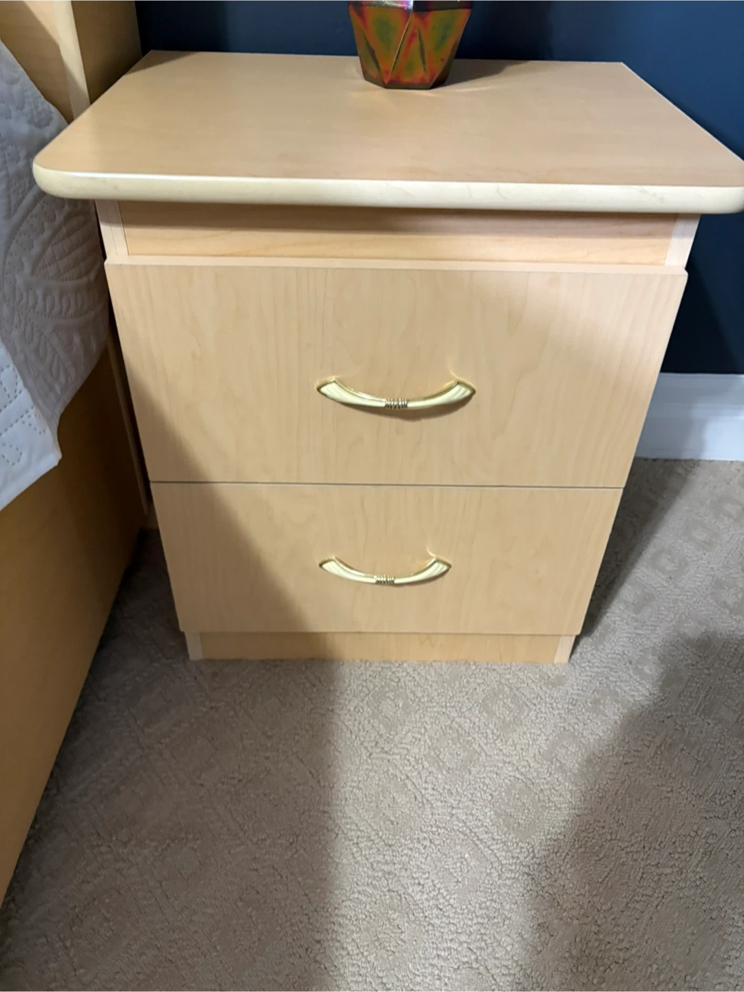 This light wood nightstand features two drawers with curved gold-toned hardware. Its light wood finish complements most bedroom decors. Provides convenient bedside storage.