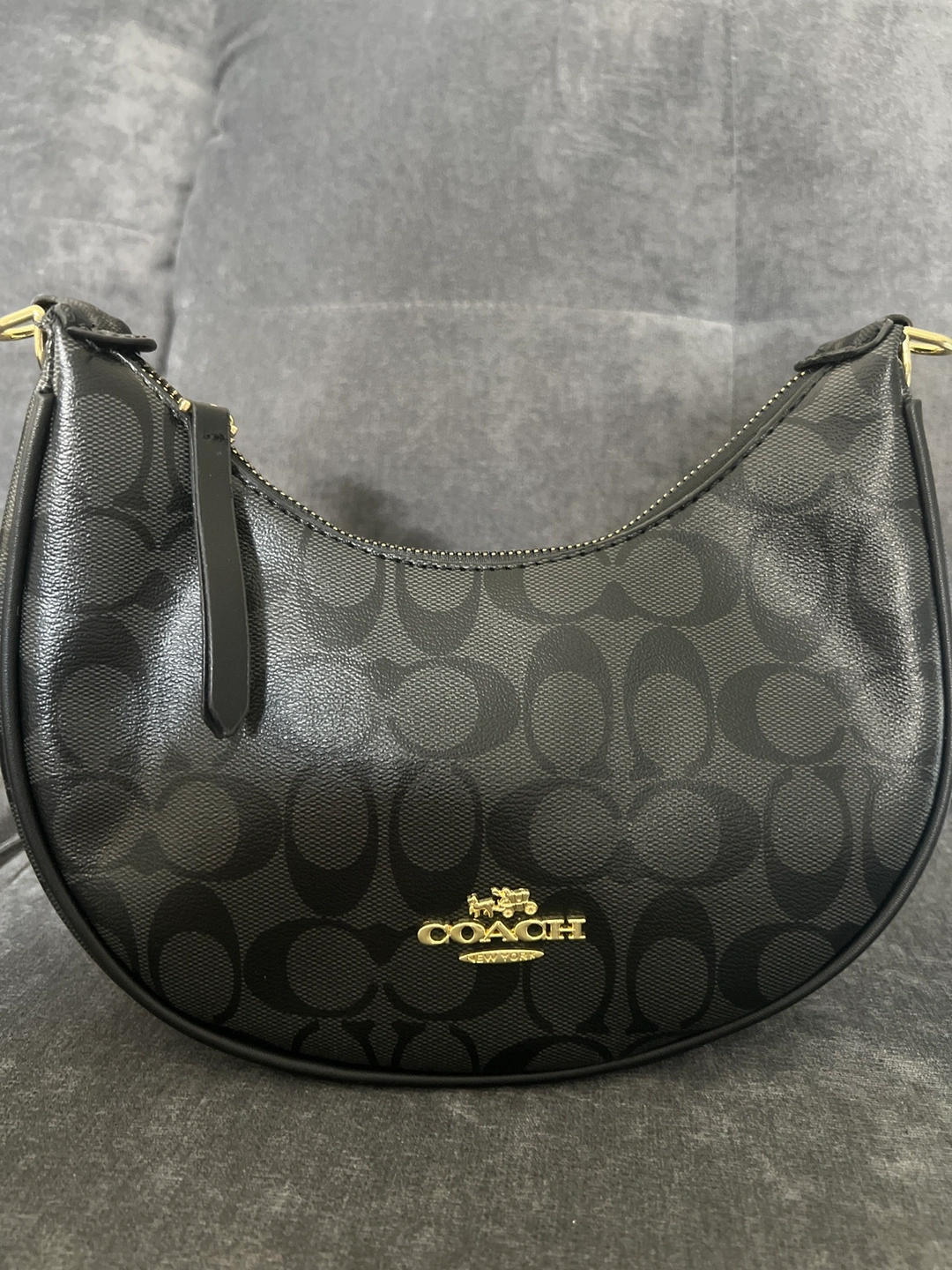 Small black Coach bag with a gold Coach logo. The bag has a short strap. The bag is in the signature Coach pattern.
