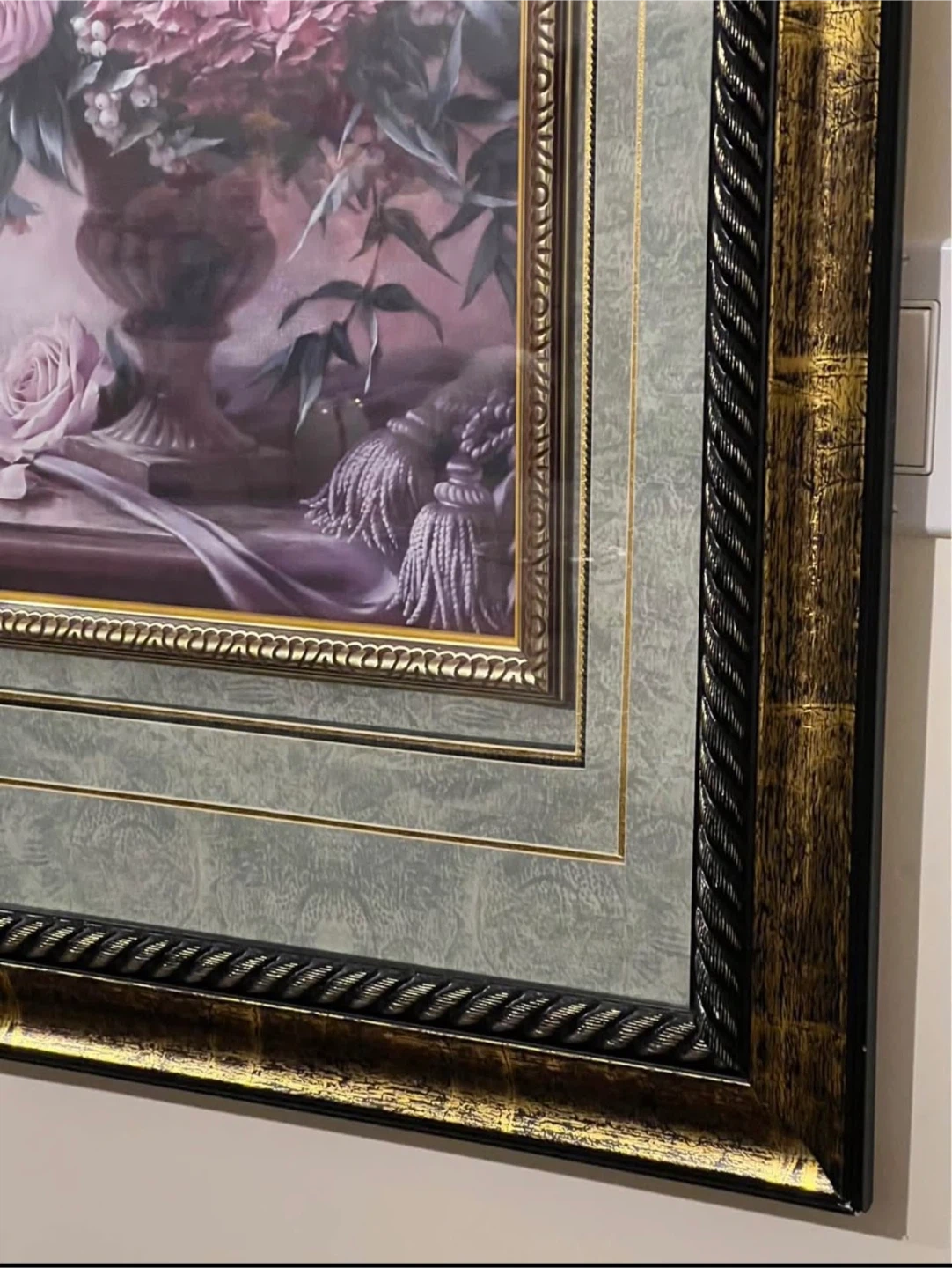 This framed wall art features a beautiful floral still life arrangement in a vase. It's housed in an ornate, multi-layered frame with gold and rope detailing. The artwork depicts roses and other blooms with delicate greenery.