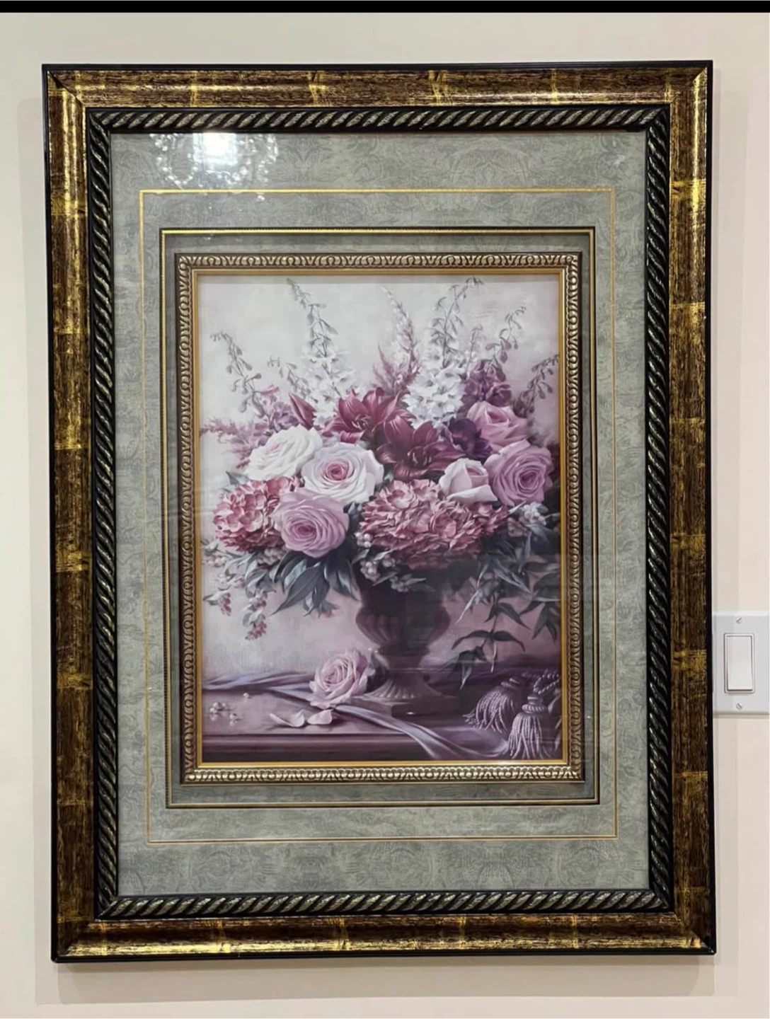 This framed wall art features a beautiful floral still life arrangement in a vase. It's housed in an ornate, multi-layered frame with gold and rope detailing. The artwork depicts roses and other blooms with delicate greenery.