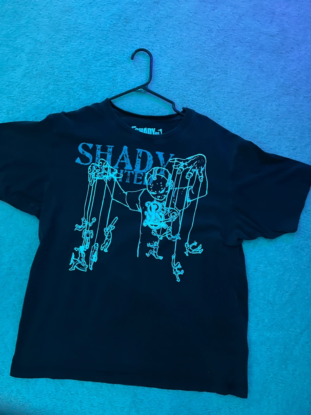 Black graphic t-shirt from Shady Records. Features a front design with puppet strings and a smaller logo on the back. Cotton material.