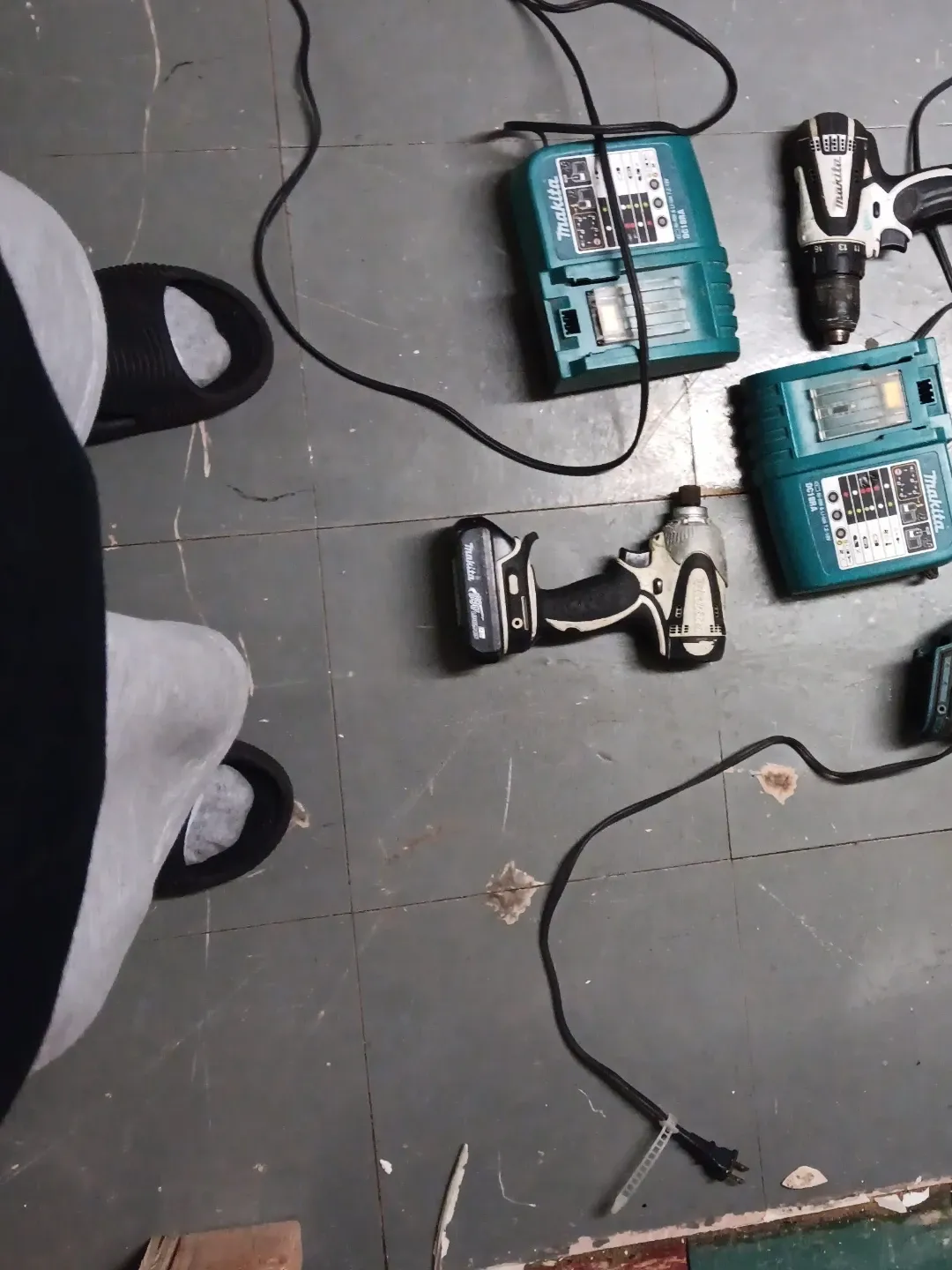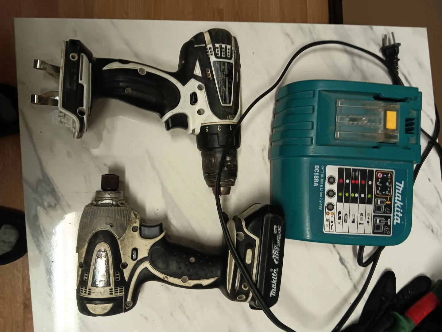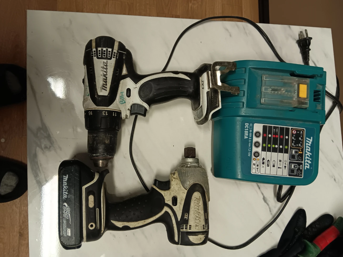 This lot includes a Makita cordless drill and an impact driver. Also included are two Makita DC18RA battery chargers. Items appear to be in used condition.normal wear and tear works good