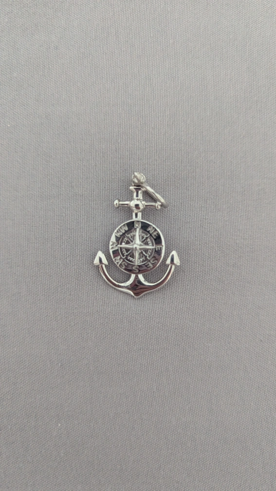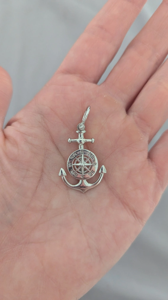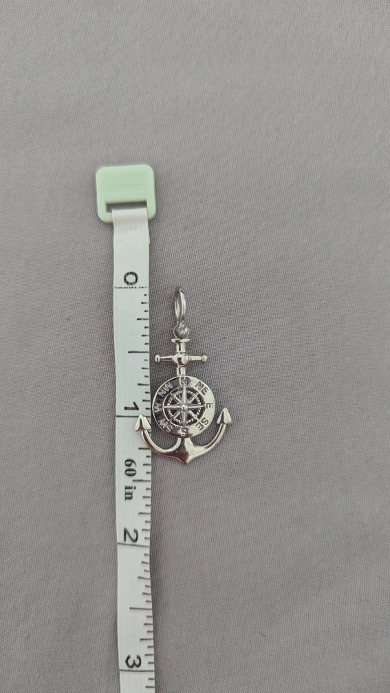 This pendant features a sterling silver anchor with a mariner compass design. It's stamped "925 PERU" on the back. The pendant measures approximately 1.5 inches in length.