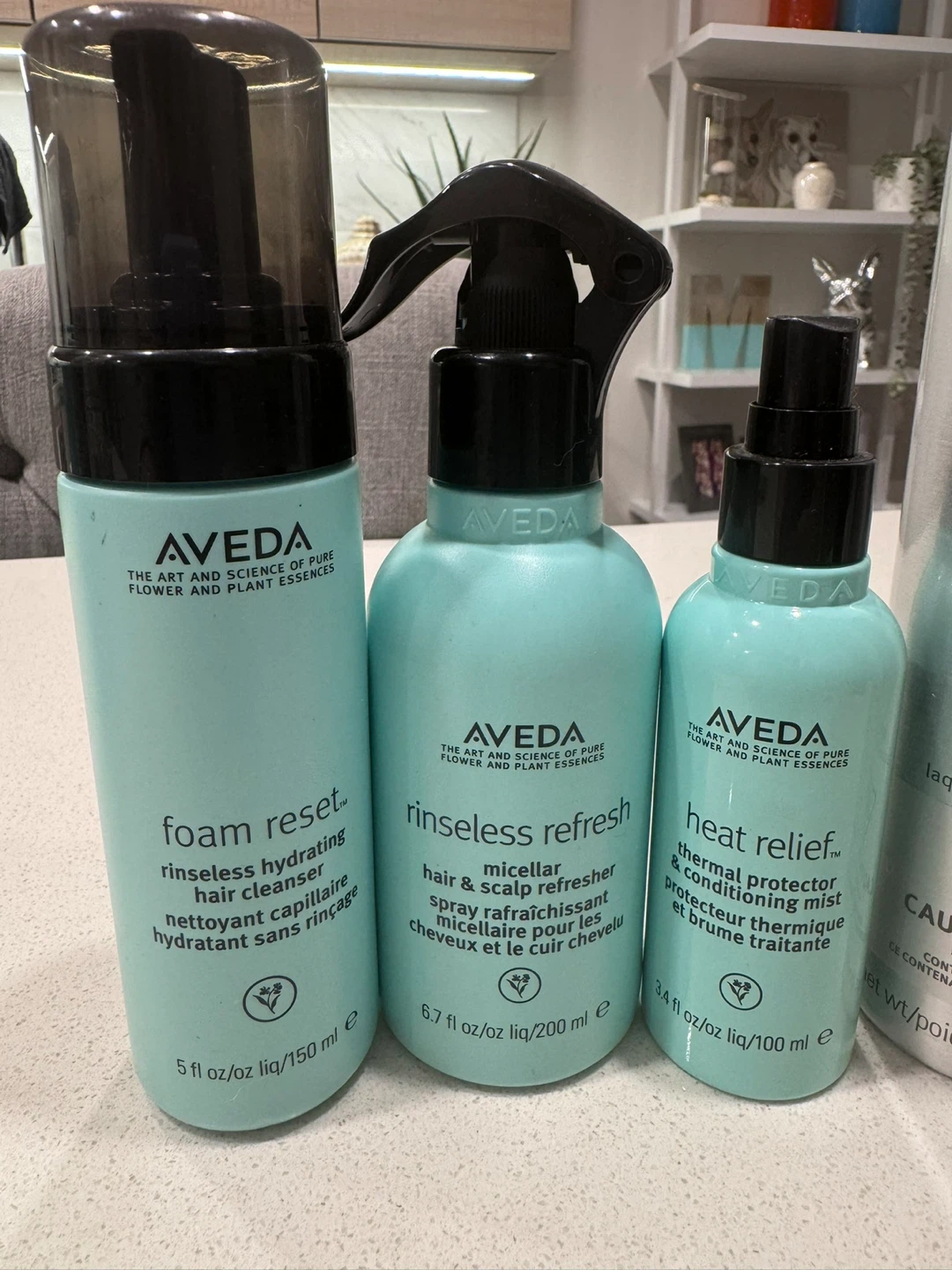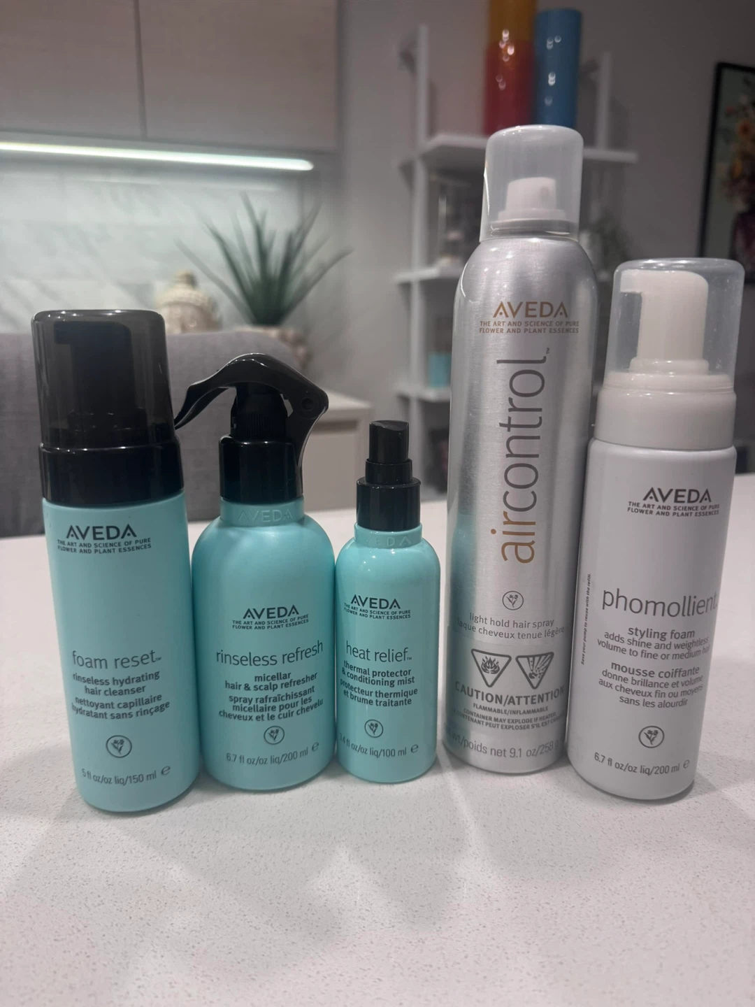 Includes Aveda Air Control light hold hair spray (9.1 oz), Phomollient styling foam (6.7 oz), Foam Reset rinseless hydrating hair cleanser (5 oz), Rinseless Refresh micellar hair & scalp refresher (6.7 oz), and Heat Relief thermal protector conditioning mist (3.4 oz). These products are designed for styling and refreshing hair.